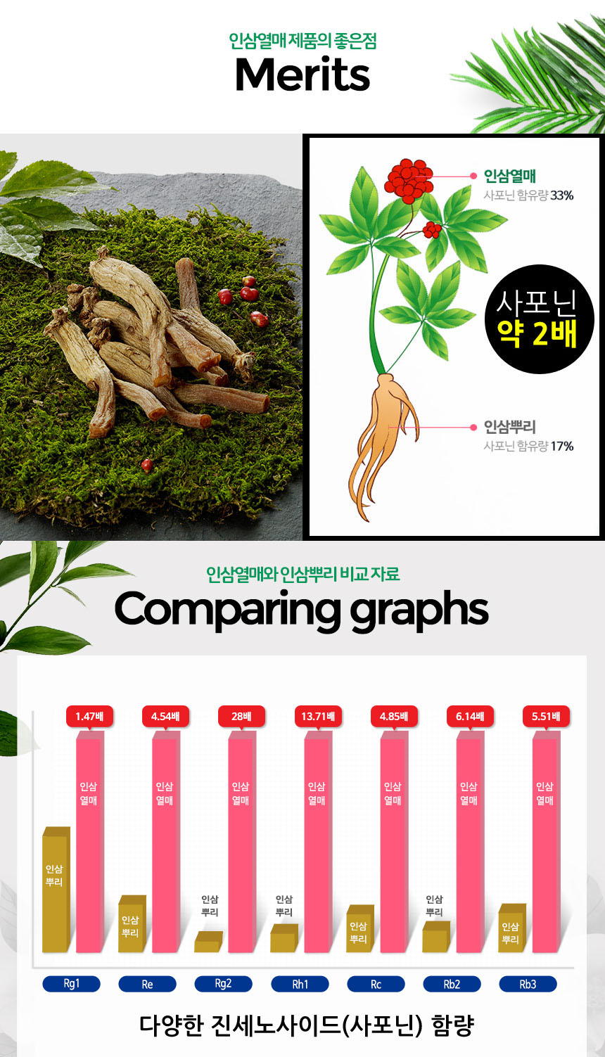 - 인삼, 홍삼보다 사포닌 함량이 월등히 높음