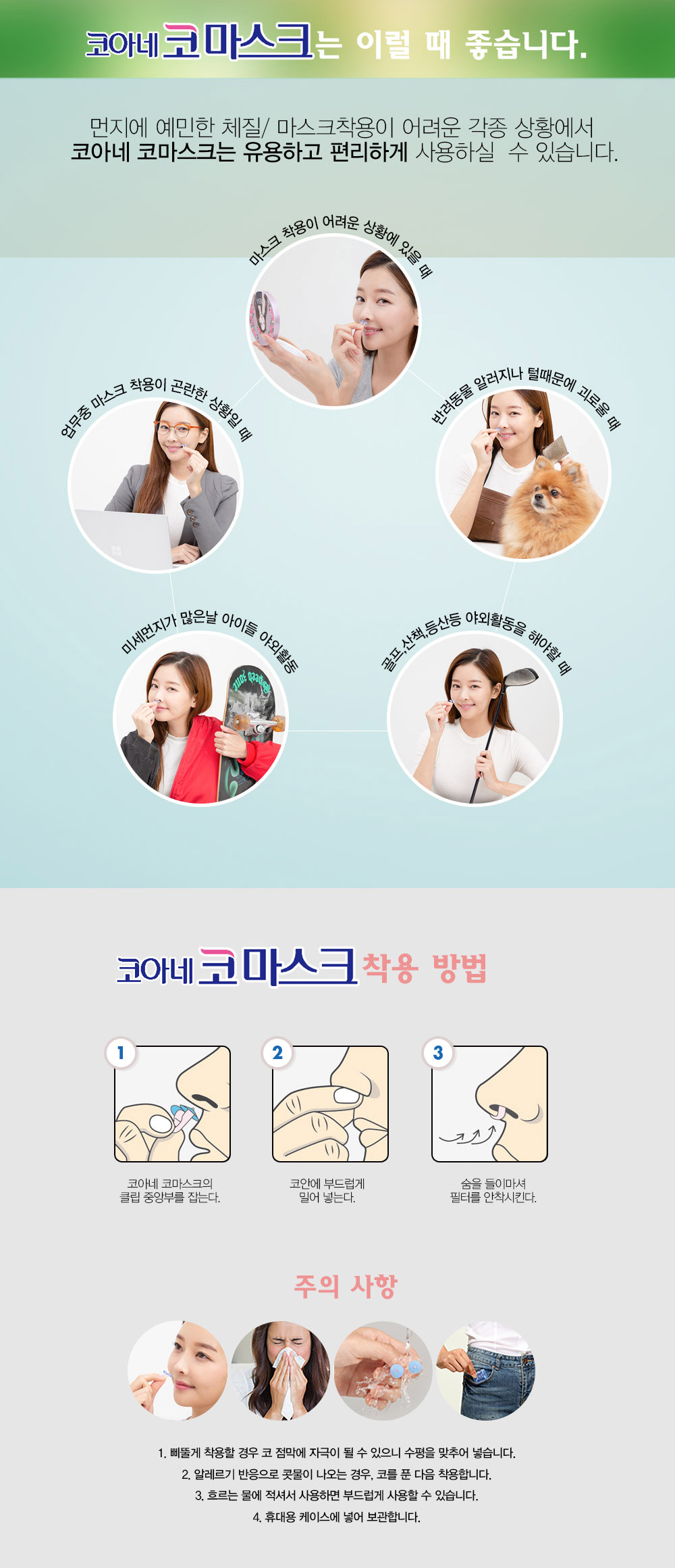 야외활동 시, 가벼운 운동 시, 업무 시, 털 알레르기가 고민일 경우 마스크 착용이 어려운 상황에 코아네 코마스크를 사용해보시는 건 어떨까요?!