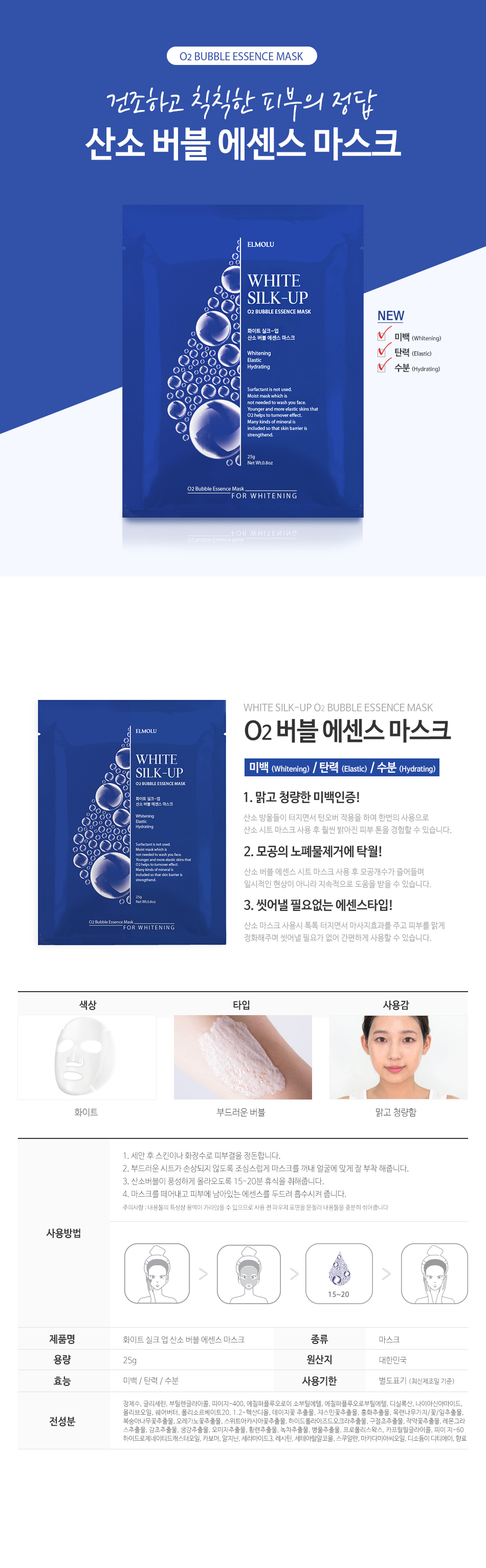 | 제공내역 | 엘모르 화이트 실크-업 산소 버블 에센스 마스크 1 SET (5P)