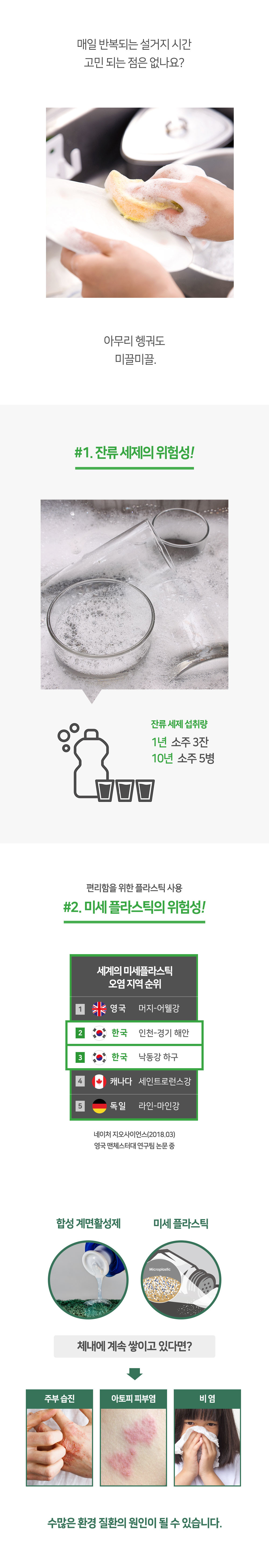 - 일반 주방세제 사용시 잘 헹구지 않으면 잔류 세제가 남게되고, 일년에 약 소주 2~3잔, 10년 동안 소주 5병가량을 마시게 됩니다.