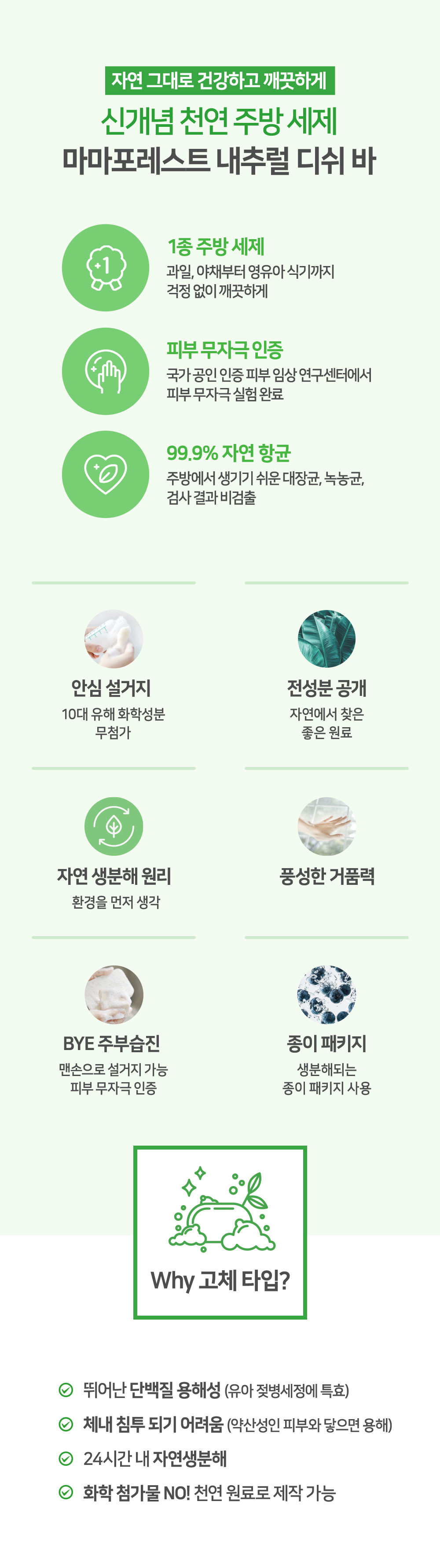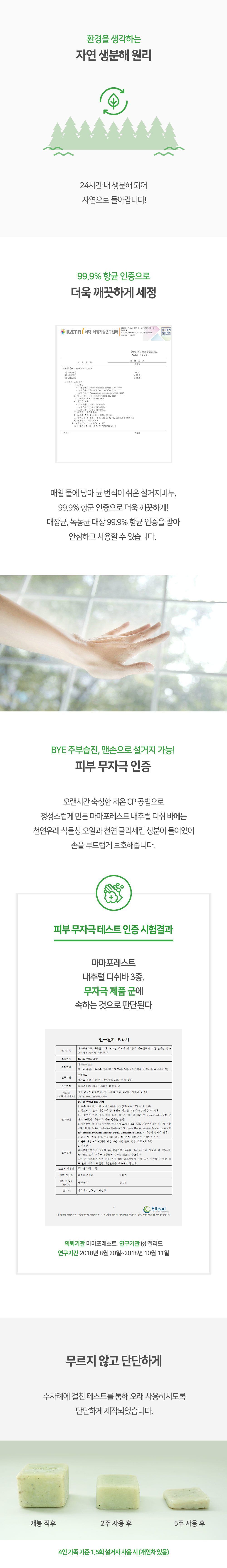 - 특별한 고체타입! : 뛰어난 단백질 용해성(우유 단백질이 남아있는 유아 젖병세정에 특효) / 체내 침투되기 어려움(약산성인 피부와 닿으면 용해), 24시간 내 자연생분해 / 화학첨가물 No! 천연원료들 위주로 제작