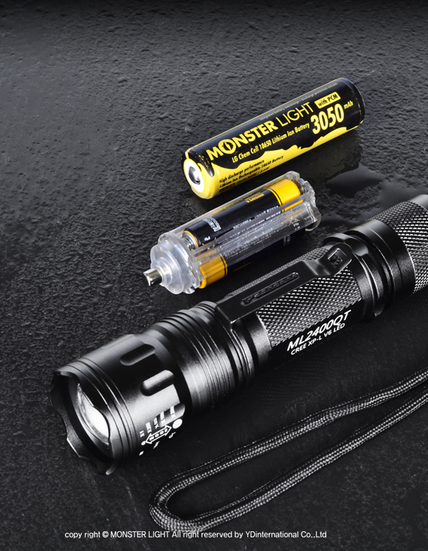 몬스터라이트는 고출력 제품이기 때문에 일반적으로 18650 충전 배터리 사용을 권장합니다. 라이딩, 캠핑, 낚시, 등산 등 아웃도어를 즐기시는중에 갑자기 배터리 방전이 되면 난감하겠죠? AAA 배터리 3개로도 호환이 되어 2시간 정도 쓰실 수 있습니다.