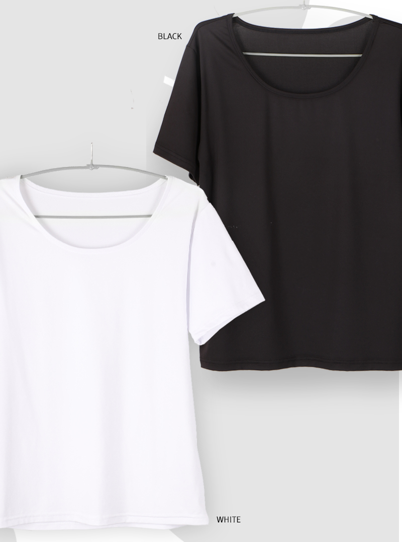 목이 넓게 파인 라운드형으로 겉 옷을 입었을때 보이지 않아
