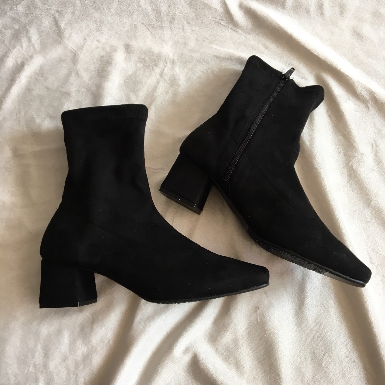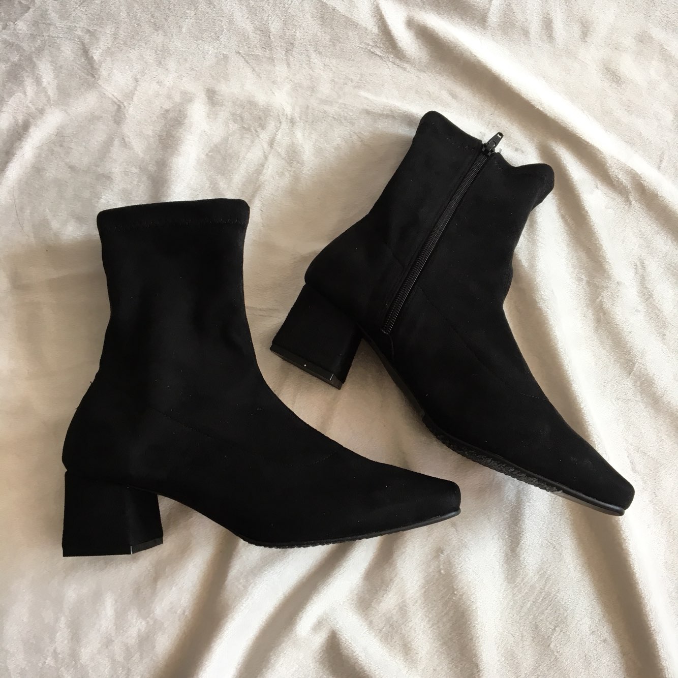 스웨이드 앵클 삭스부츠 7.5cm통굽힐 블랙 브라운 : 메이아망뜨