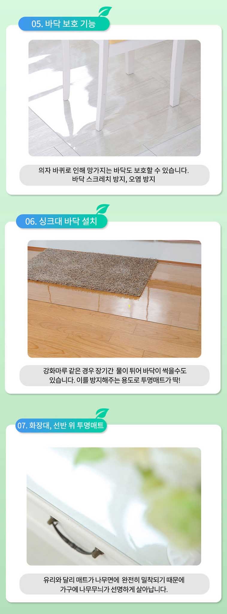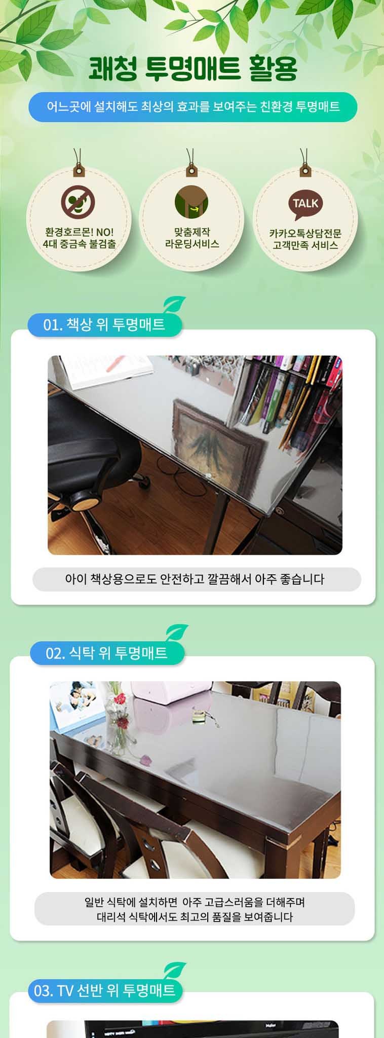3mm 사용용도 : 식탁매트, 책상매트, 방수매트, 유리대용매트, 바닥보호, 마루보호, 기스방지, 식탁데코, 탁자매트