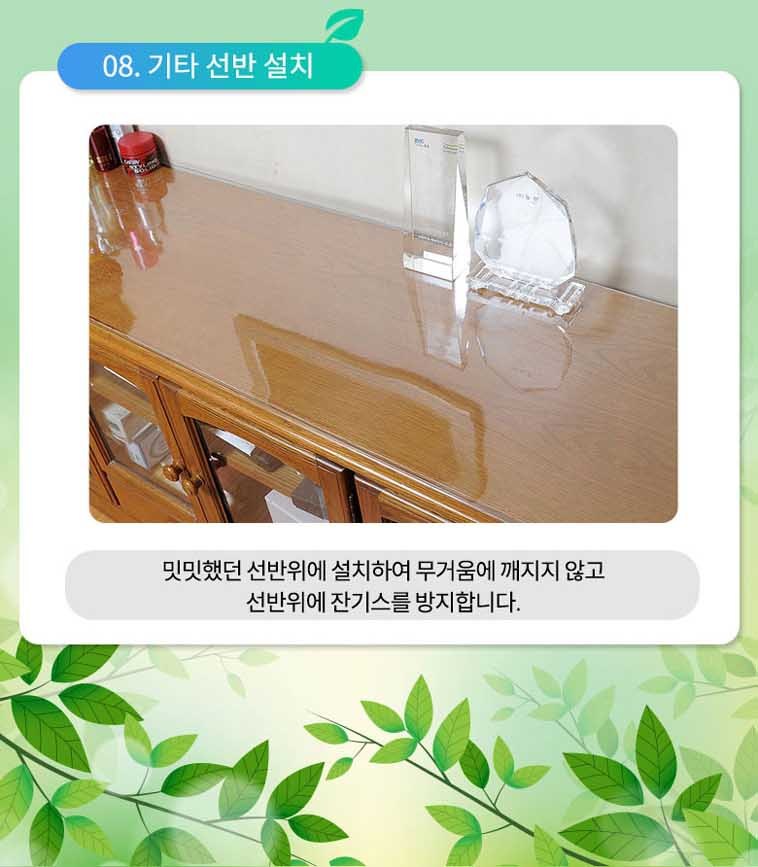 2mm 사용용도 : 책상매트, 테이블매트, 데스크매트, 유리대용매트, 바닥보호매트, 신발장 및 가구보호매트, 탁자매트