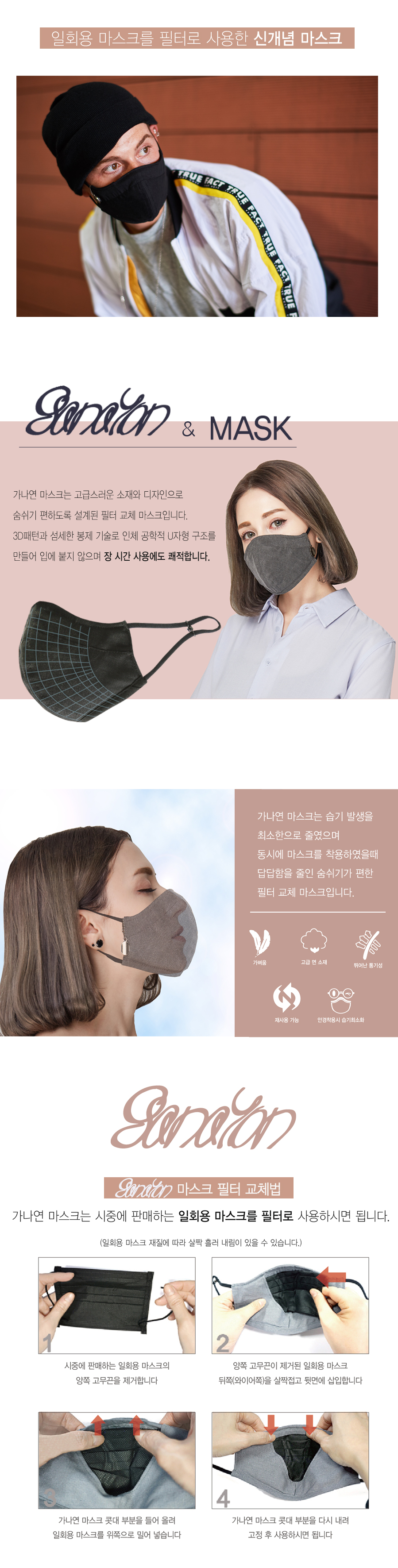 - 기존 필터교체형 마스크의 자체 필터교체만이 가능한점을 보완하여 가나연 마스크는 일회용마스크를 필터로 사용하는 신개념 필터교체형 마스크 입니다.