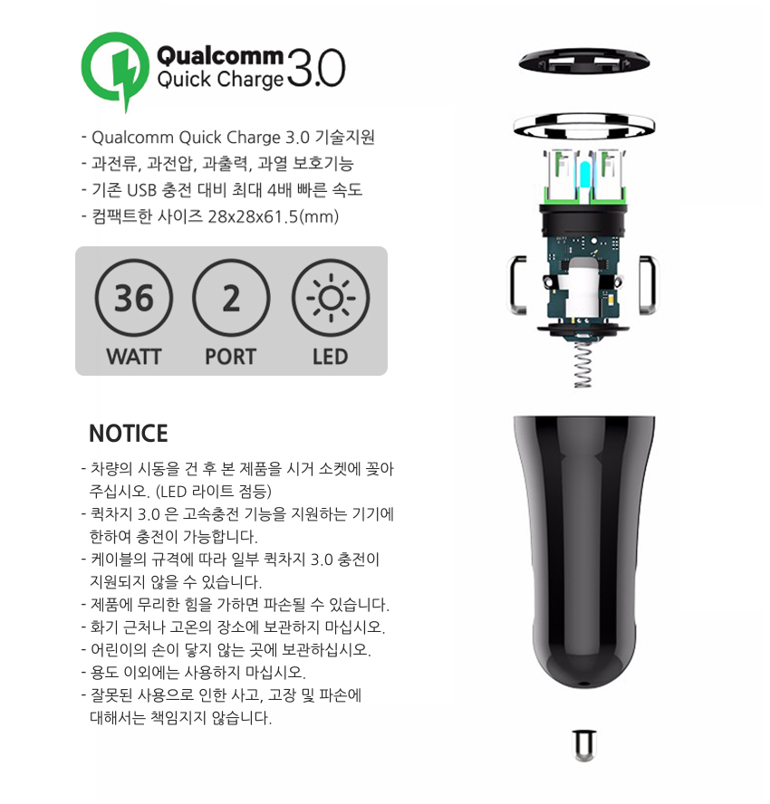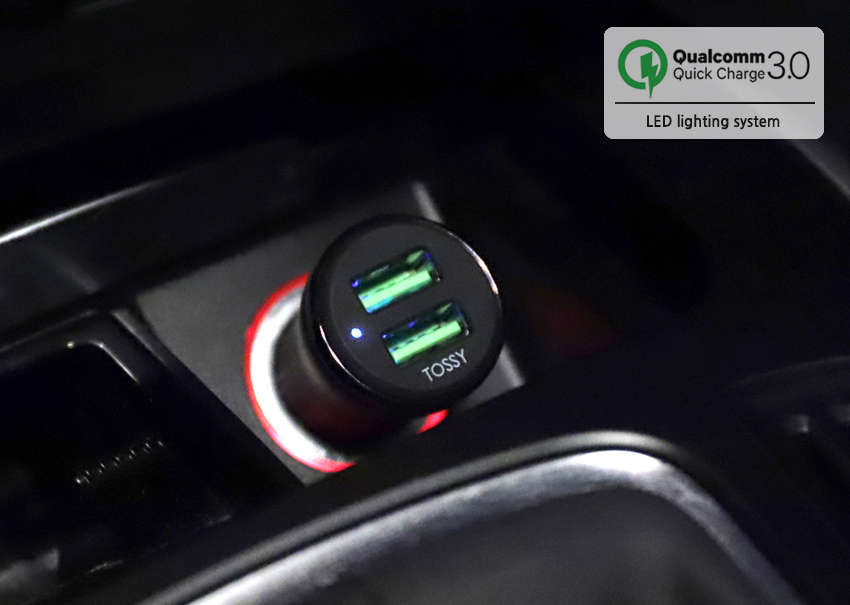 토씨 퀄컴 퀵차지 3.0은 시거잭 연결시 푸른빛의 LED 라이트 기능이 작동됩니다.