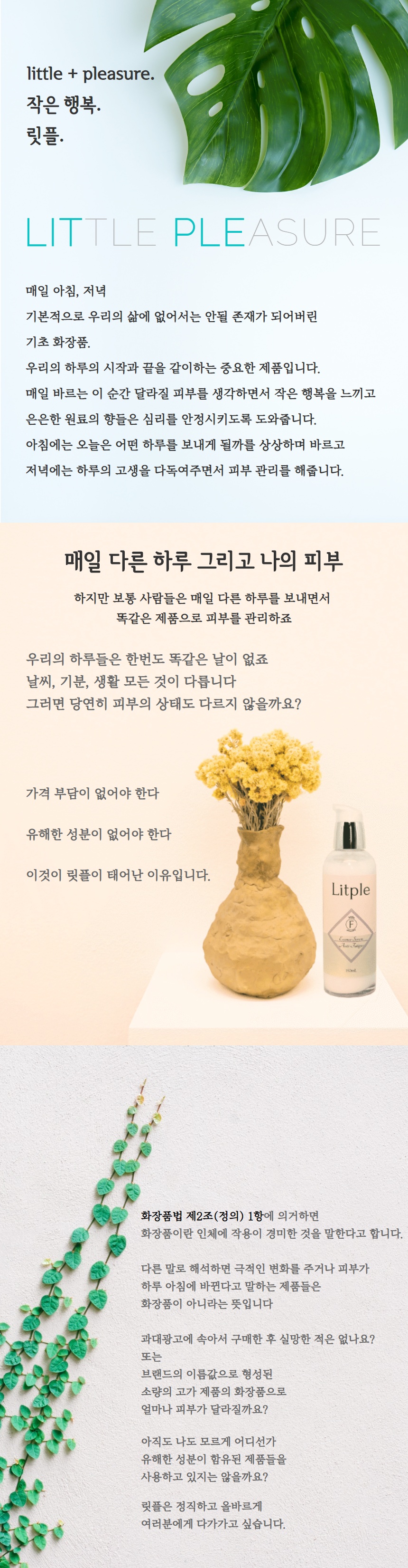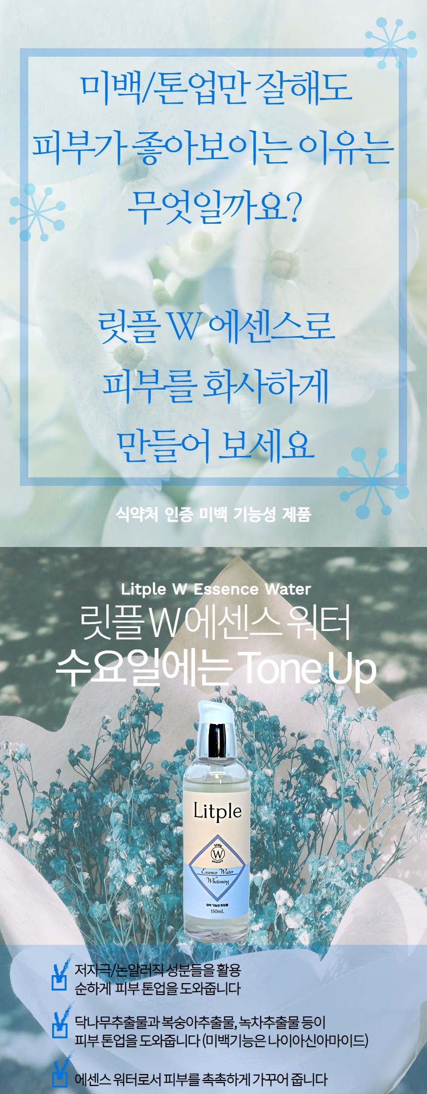 |  | 미션1. 내용에는 제품명을 반드시 포함해주세요. => 릿플(Litple) 에센스 워터 미션2. 사진은 최소 5장 이상 첨부해주세요.  - 제품 점성이나 발림성이 나타난 사진 필수 미션3. 안전한 성분, 가성비가 매우 좋다는점, 순한 성분이라는 내용을 꼭 강조해주세요. 미션4. 단순 제품 소개만이 아니라, '다른 제품과 비교하여 이 제품만이 가지고 있는 의미있는 특이점'들을 찾아 세부적으로 묘사해주세요. 미션5. 다음 내용으로 포스팅을 마무리 해주세요.  - 개인적으로 제품에서 가장 마음에 들었던 점.  - 어떤 사람들에게 추천하는지, 어떤 사람들이 좋아할 것 같은지에 대한 제안 |  |