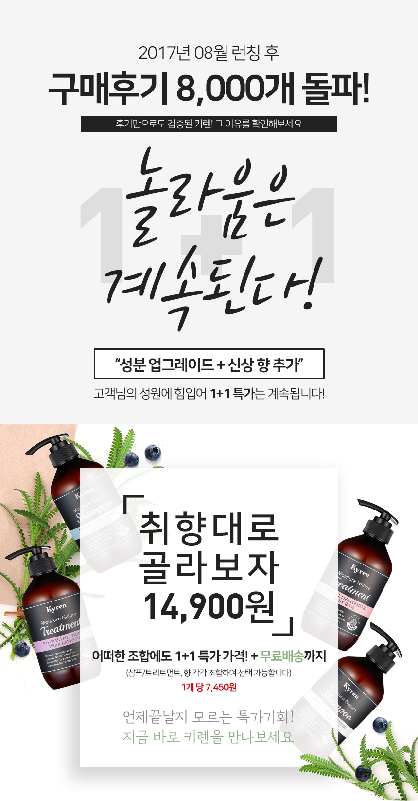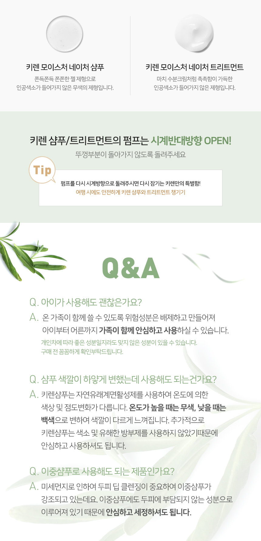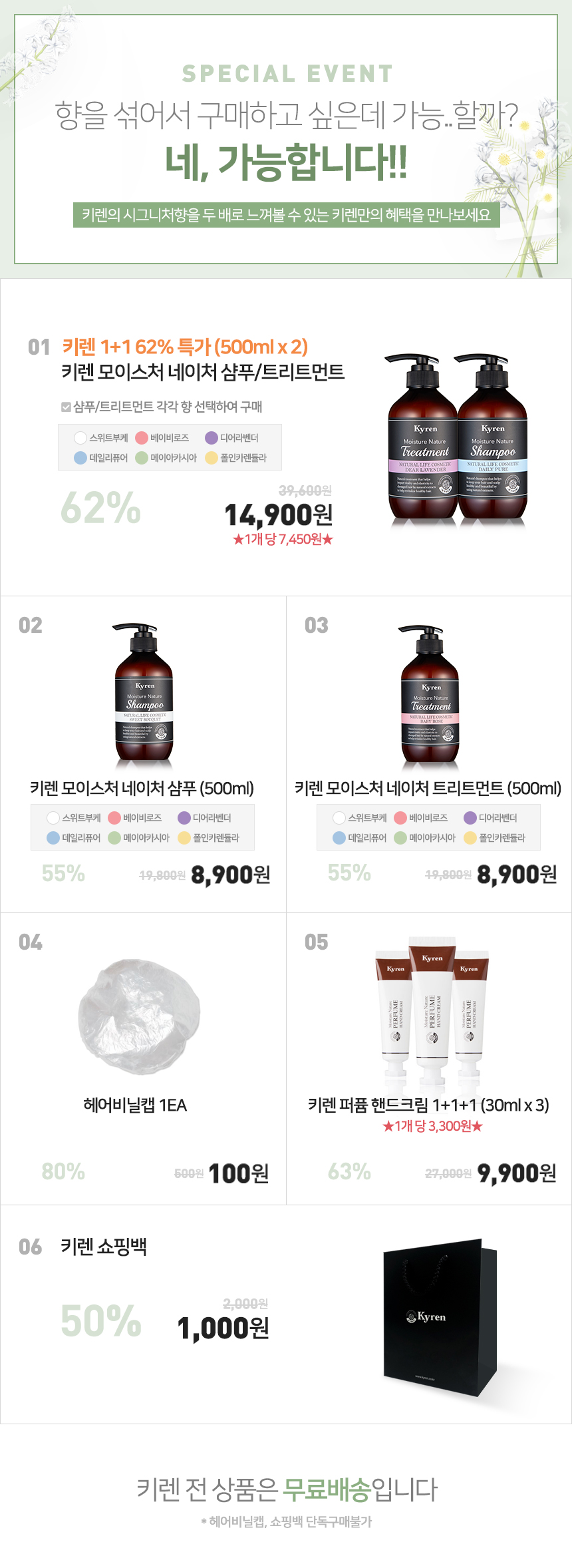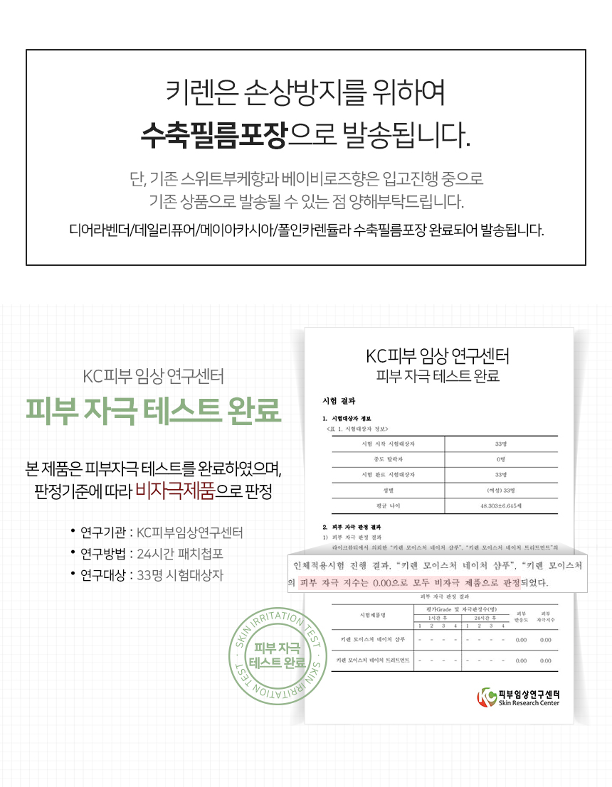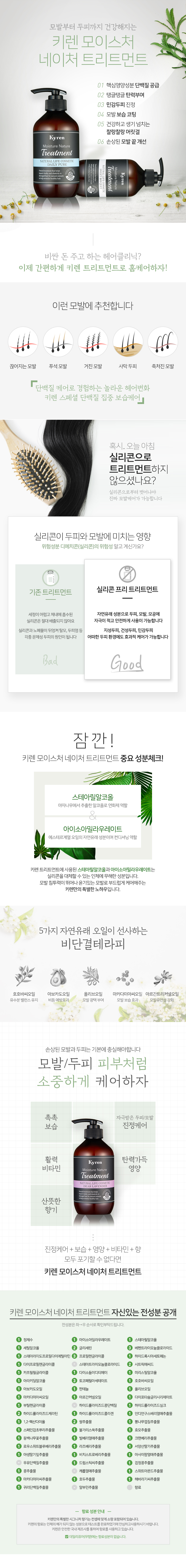 | 제공내역 | 키렌 모이스처 네이처 샴푸1개 +트리트먼트 1개 (6가지 향 랜덤 / 선택불가)
