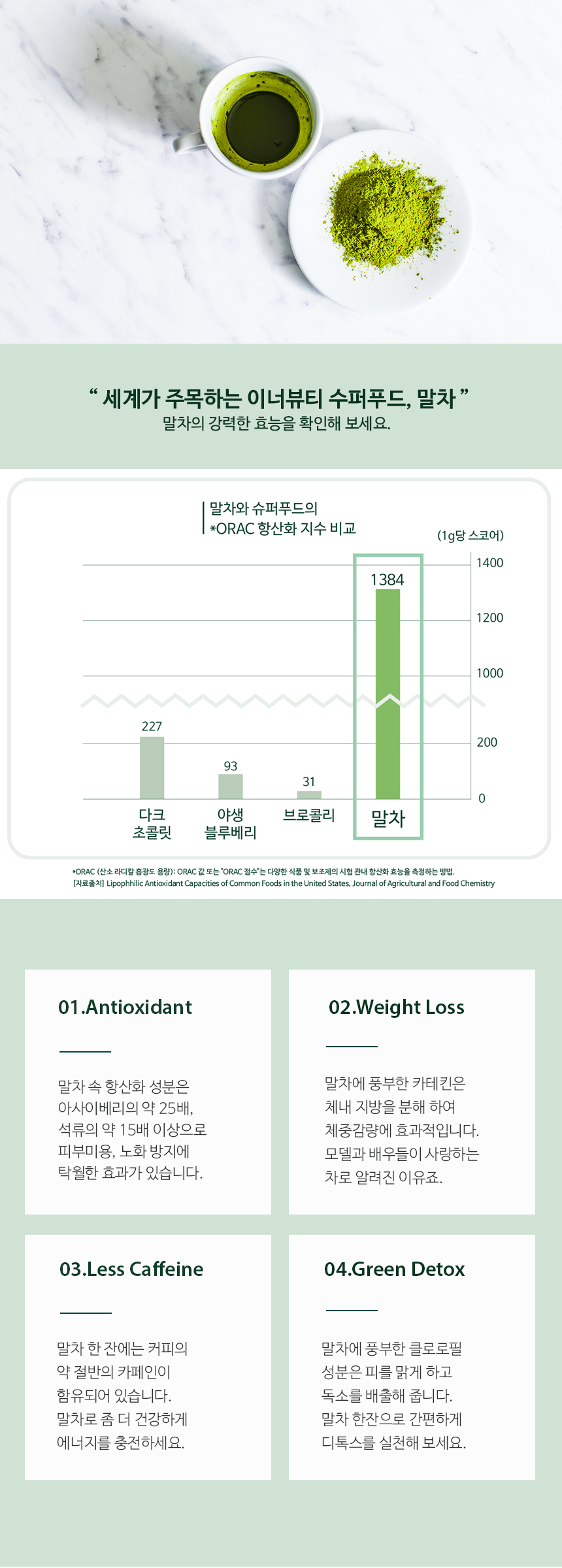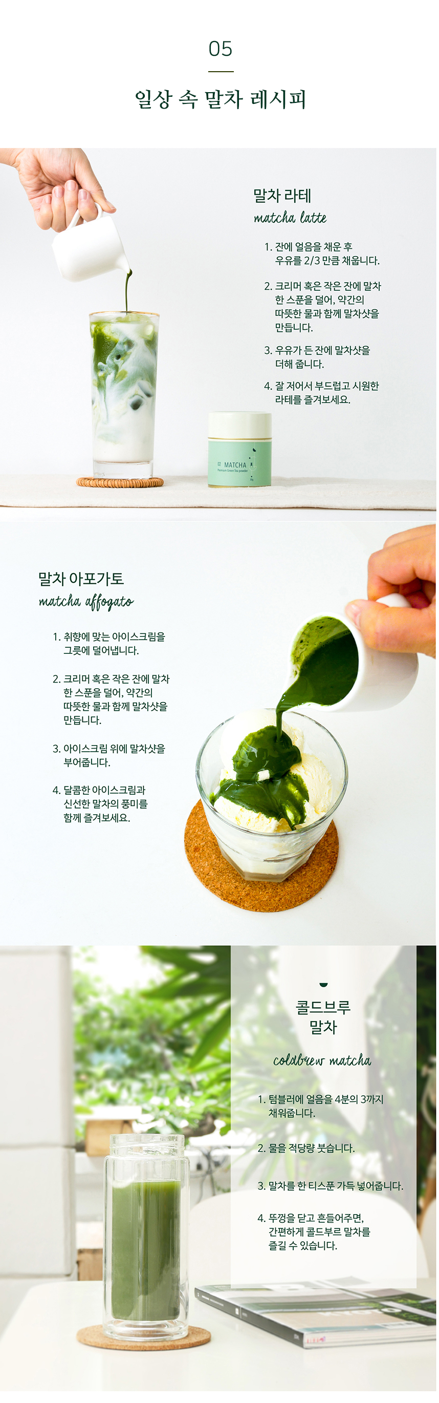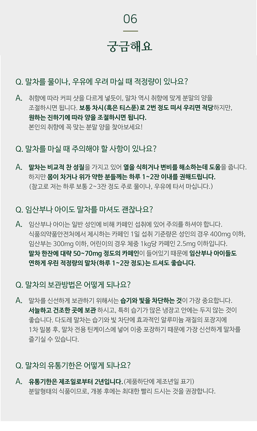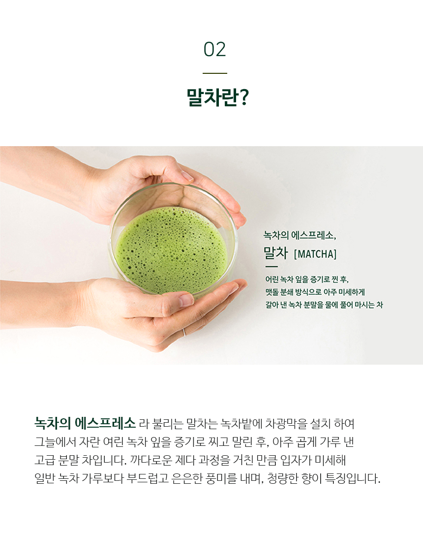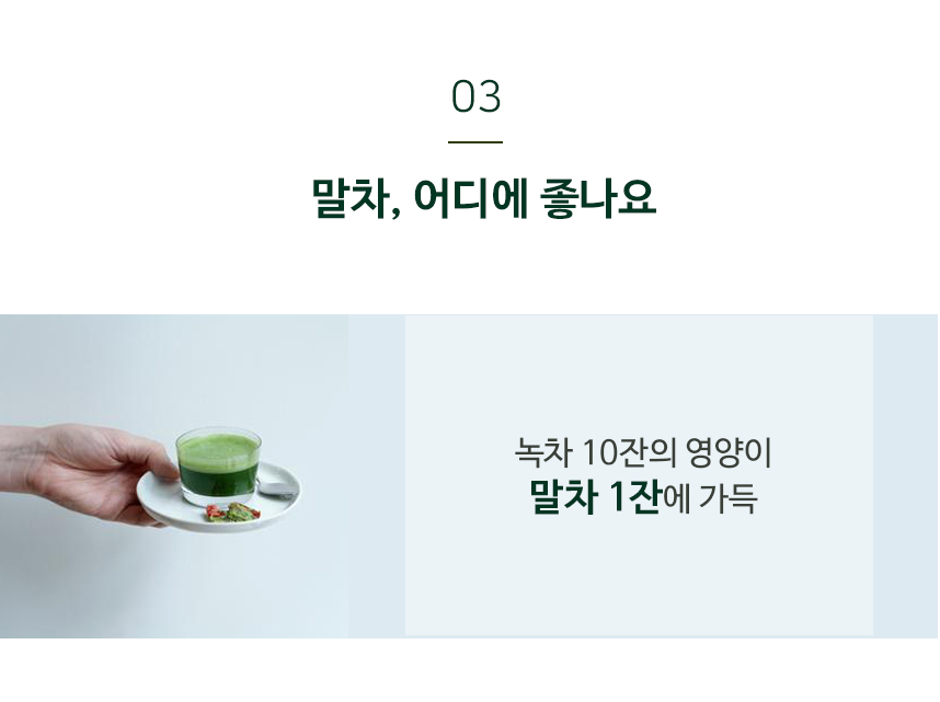 - 여린 녹차잎만을 아주 곱게 갈아내서 인지 쓰거나 떫지 않고 부드럽다.은은하다.   - 카페에서 파는 말차라떼는 설탕, 시럽을 너무 많이 넣어서 달기만 한데, 말차가루로 직접 만들어 보니 달지 않고 부드러워서 더 좋다.- 가루가 고와 물에 타면 잘 녹아 어디서든 마시기 좋다.