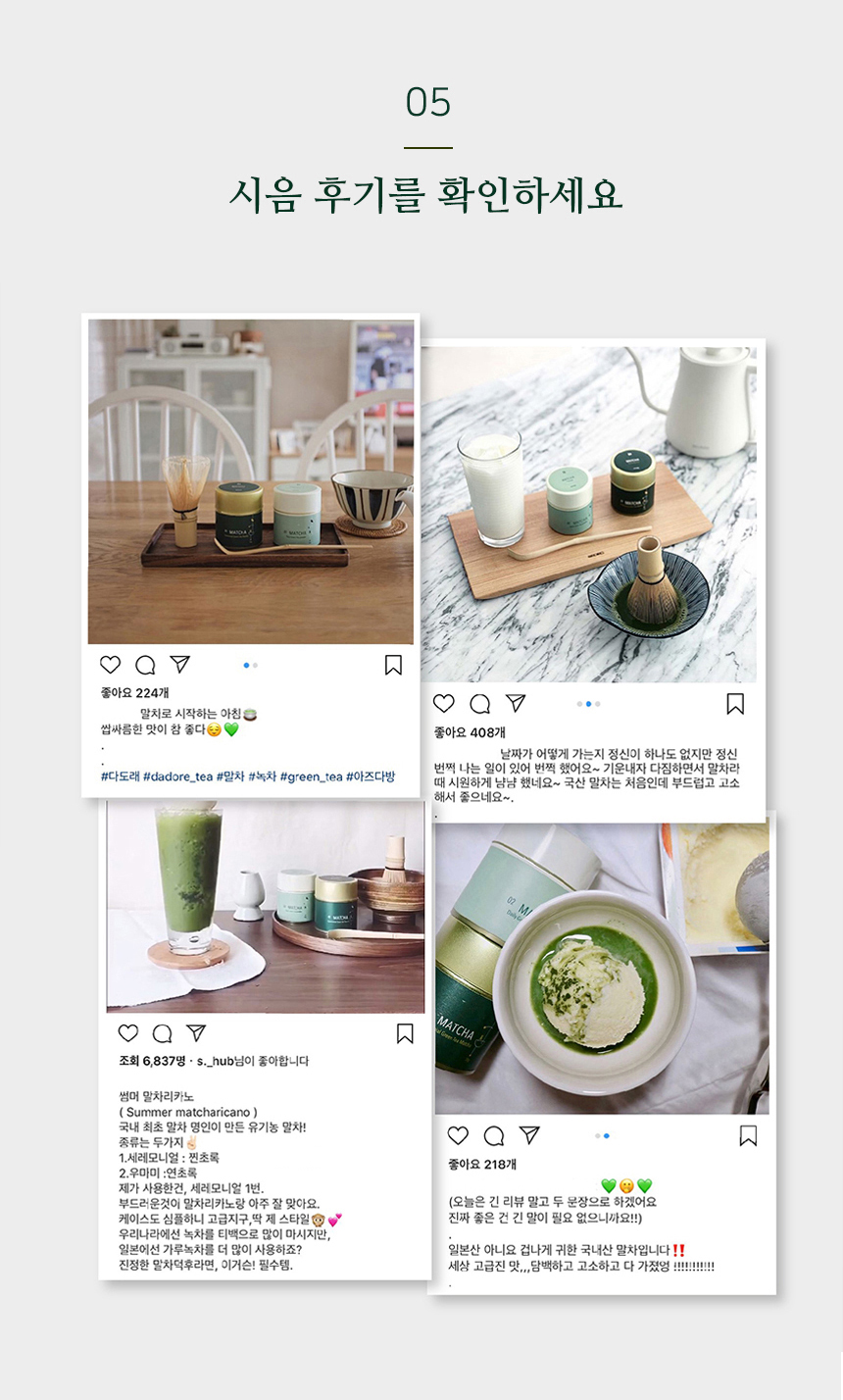 - 올 해는 커피나 단 음료수 줄이고, 말차 마시면서 이너뷰티&건강 관리해 보자는 언급 미션7. 리뷰 하단에 홈페이지 주소를 소개해주세요. ☞ https://smartstore.naver.com/dadore |