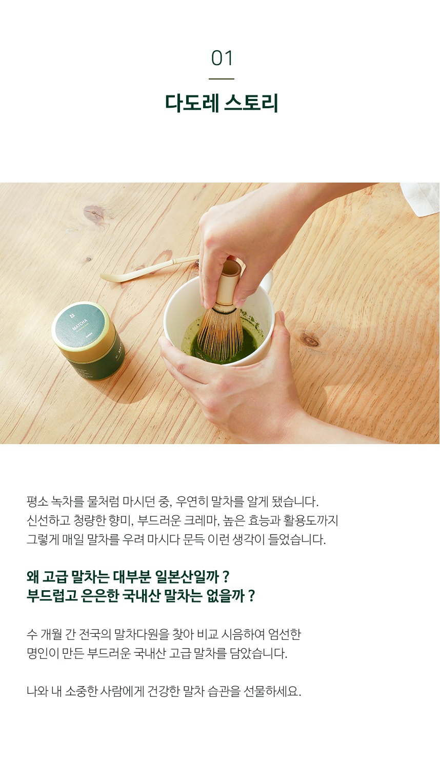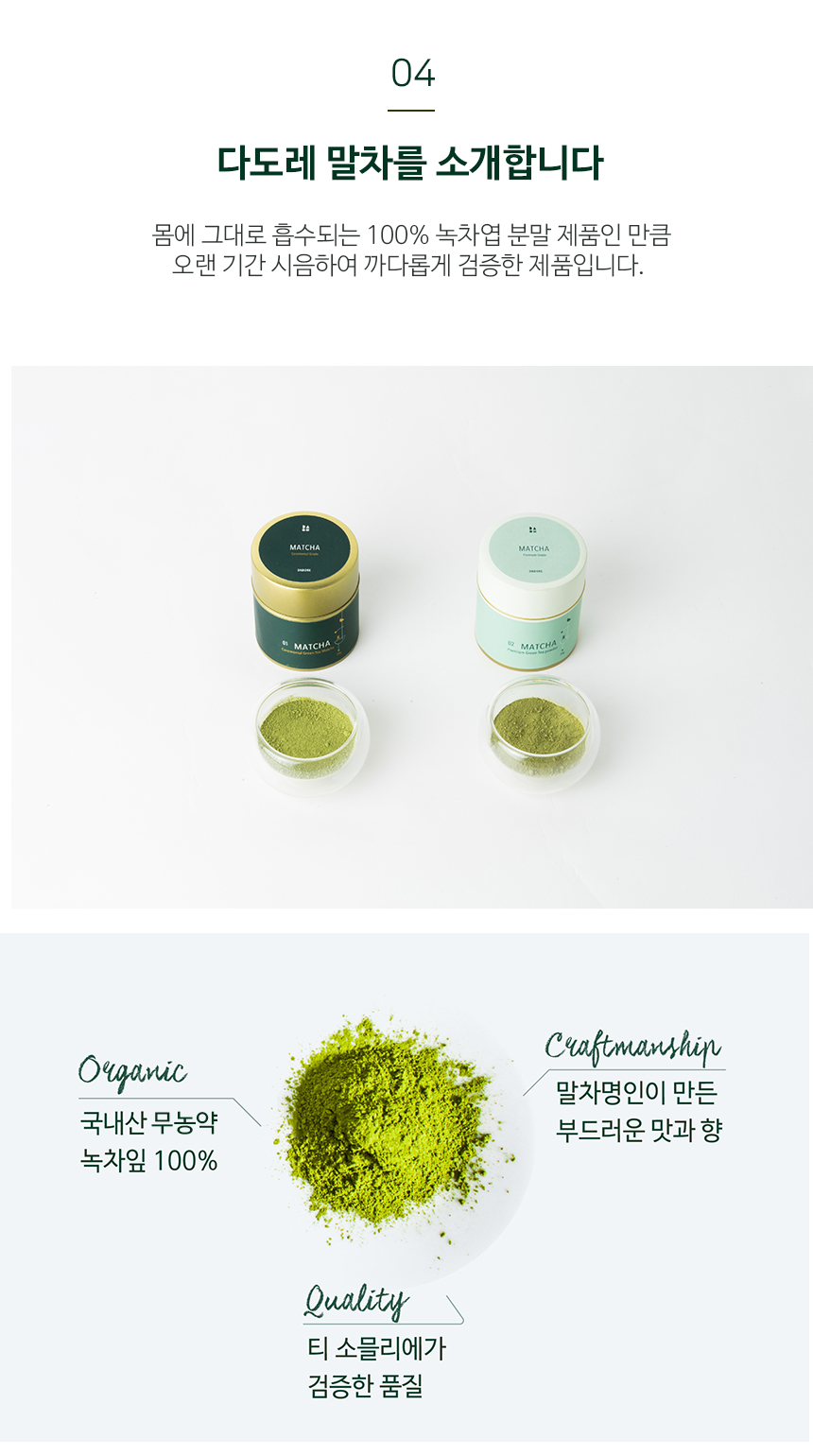 | 미션1. 리뷰 제목에는 제품명(다도레 말차)을 반드시 포함해주세요. 미션2. 동영상 1개 이상, GIF 이미지(움짤) 1개 이상, 사진은 10장 이상 첨부해주세요.   - 말차 우리는 영상 or 마시는 영상 등 미션3. 실제 시음해 보신 후, 느낀 점을 편하게 작성해 주세요. (자세히) 미션4. 단순 제품 소개만이 아니라, '다른 제품과 비교하여 이 제품만이 가지고 있는 의미있는 특이점'들을 찾아 세부적으로 묘사해주세요. 미션5. 항산화 성분이 높고 비타민, 섬유질이 풍부해 피부미용과 다이어트 등에 좋다는 점, 카페인이 커피보다 절반 정도라, 커피 대신 마시기 좋다 등 말차의 장점을 에디터님의 말투로 자연스럽게 설명해주세요. 미션6. 다도레 말차만의 우수한 점을 자연스럽게 설명해주세요.- 일본산이 아닌 국내산 무농약/무첨가 말차라서 안심하고 마실 수 있다.