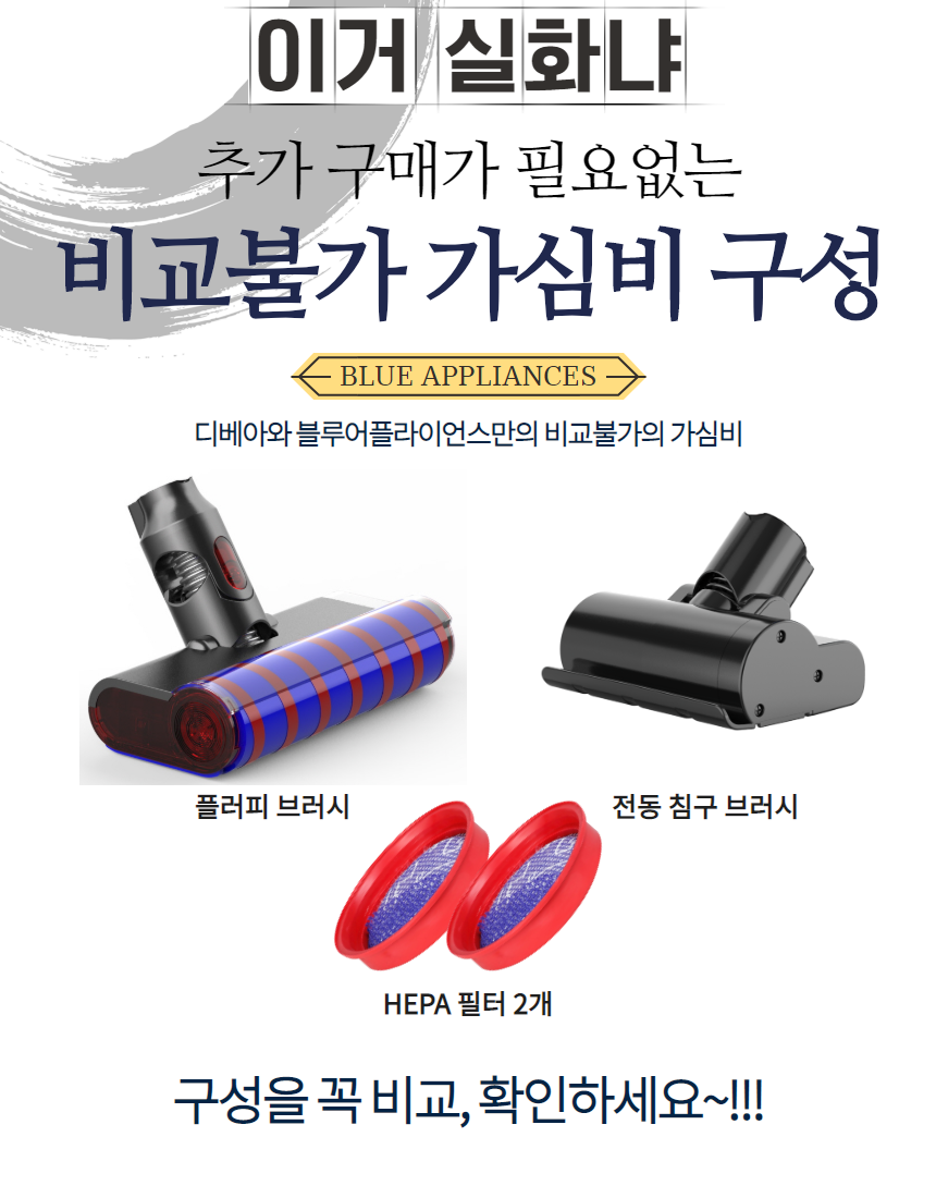 |  | 미션1. 리뷰 제목에는 제품명(디베아 무선청소기 플러피)을 반드시 포함해주세요. 미션2. 사진은 10장 이상 첨부해주세요. 미션3. 다음 내용을 포스팅 내에 강조해주세요.  - 초광폭 전동 브러시  - 타사는 별도 구매해야 하는 39,000원 상당의 플러피 브러시와 21,000원 상당의 전동침구 브러시를 기본구성으로 판매.  - HEPA 필터 2개 기본제공  - 강한 흡입력과 뛰어난 가성비.  - 본체 2년 품질보증 미션4. 단순 제품 소개만이 아니라, '다른 제품과 비교하여 이 제품만이 가지고 있는 의미있는 특이점'들을 찾아 세부적으로 묘사해주세요. 미션5. 다음 내용으로 포스팅을 마무리 해주세요.  - 개인적으로 제품에서 가장 마음에 들었던 점.  - 어떤 사람들에게 추천하는지, 어떤 사람들이 좋아할 것 같은지에 대한 제안 미션6. 리뷰 하단에 홈페이지 주소를 소개해주세요. ☞ https://smartstore.naver.com/blueappliance/products/4175020562 |  |