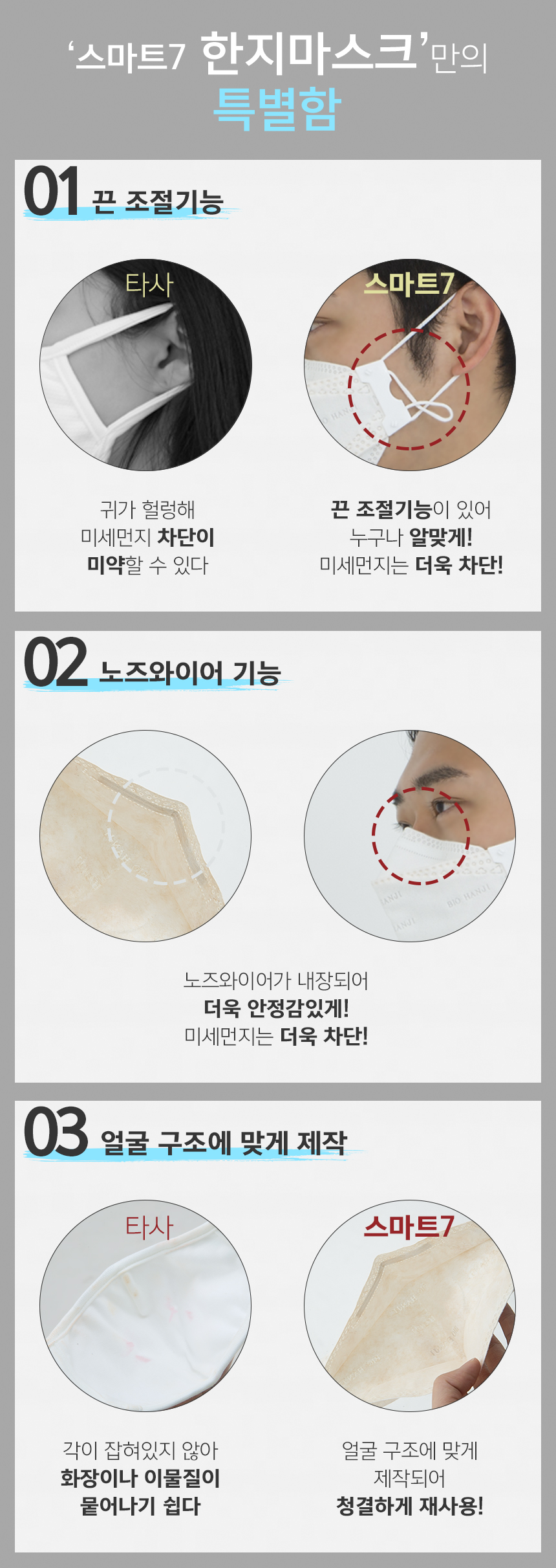 [6차] 스마트7 초미세먼지 한지마스크 KF80 3개(흰색,파랑,분홍) +KF94 1개(흰색)