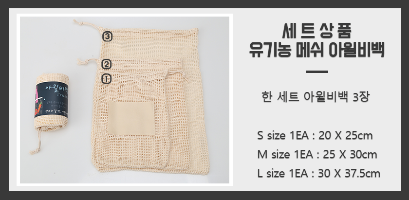 왼쪽부터 L,M,S : L의 경우 다양한 과일, 채소를 넣기에 충분하여 바코드 부착란 크기가 비례해서 크답니다~
