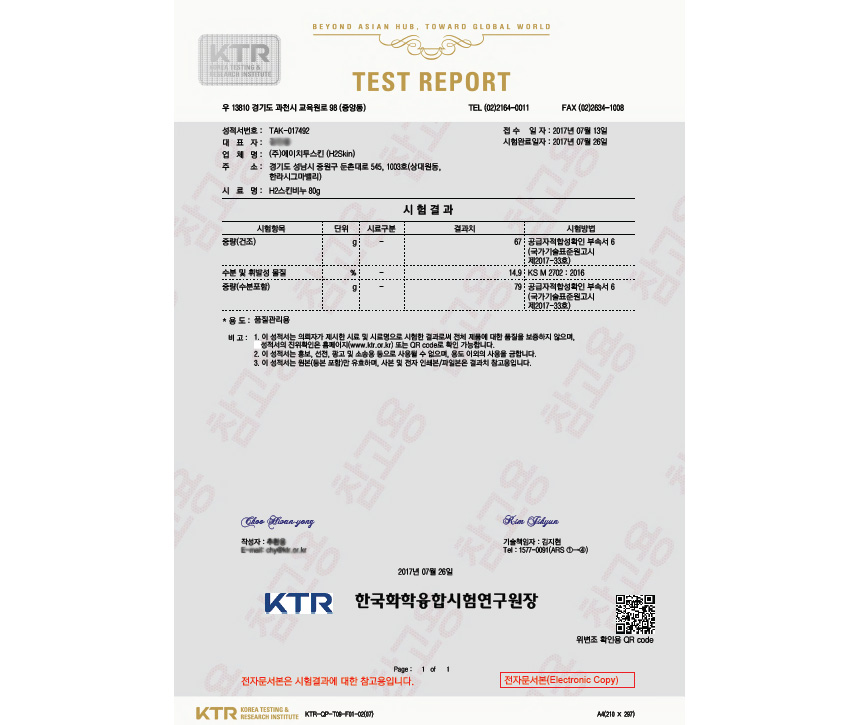 한국화학융합시험연구원에서 엄격한 시험을 거쳐 인증을 받고 출시된 'H2SKIN 수소비누'