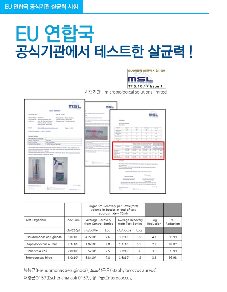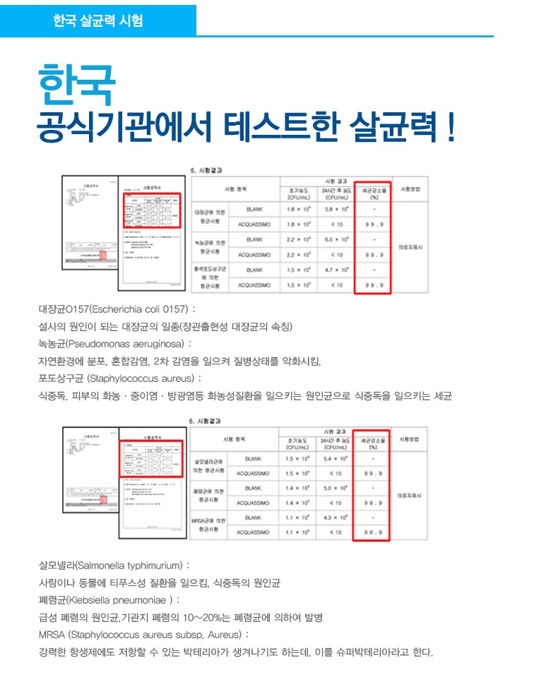 각종 세균을 제거하는 시험 결과를
