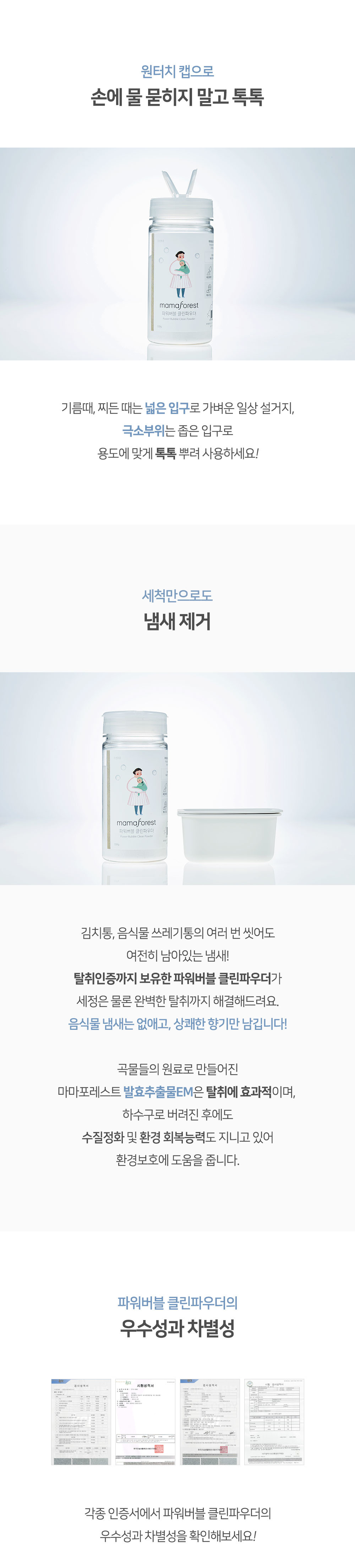 김치통, 음식물 쓰레기통의 냄새, 탈취인증을 보유한 파워버블 클린 파우더로 해결가능 합니다.