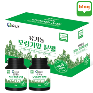 - 100% 유기농 모링가 분말로 만들어진 제품을 강조