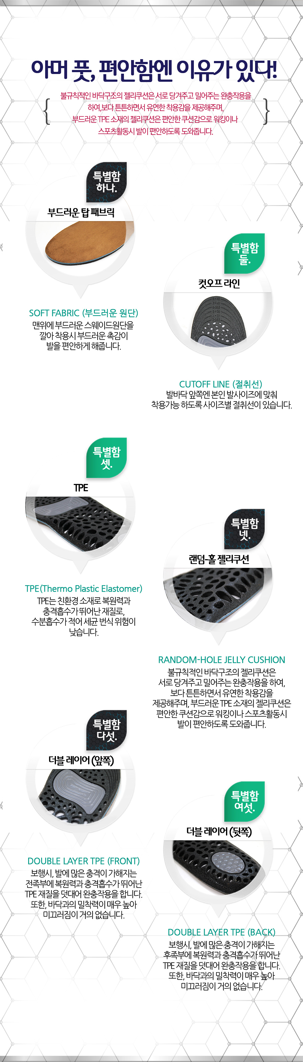 부드러운 탑 패브릭 / 컷오프 라인 / 친환경 소재 / 젤리쿠션 / 더블 레이어 / 밀착력