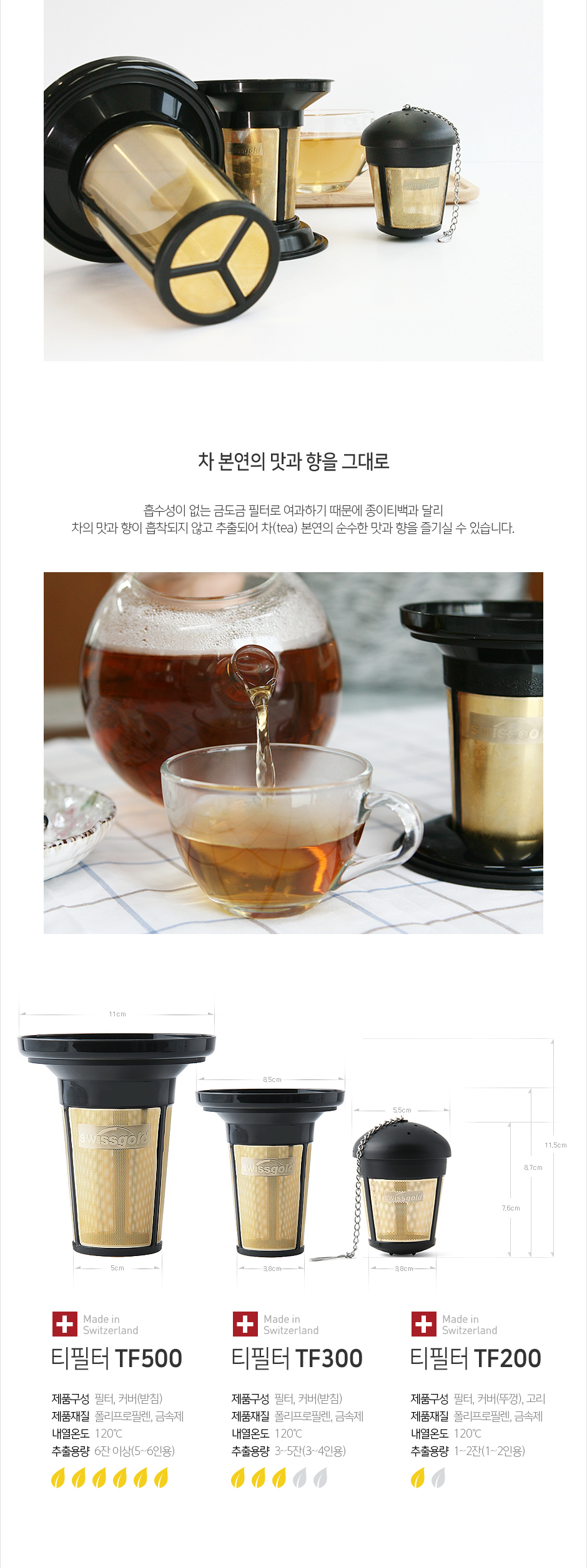 ① 종이필터는 흡수성 때문에 차의 맛을 내는 요소까지 흡수하거나 종이의 맛까지 함께 우러나오는 반면, 흡수성이 없는 순금도금 필터는 차의 맛과 향에 어떠한 영향도 미치지 않아 순수한 차의 맛과 향을 즐기실 수 있습니다.