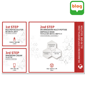 스킨케어의 올인원 솔루션 ▶ 멀티펩타이드 앰플 + 앰플마스크팩 + 이노덤 재생크림 구성의 올인원 스킨케어로, 한 장으로 간편하지만 보습 및 재생관리에 탁월함