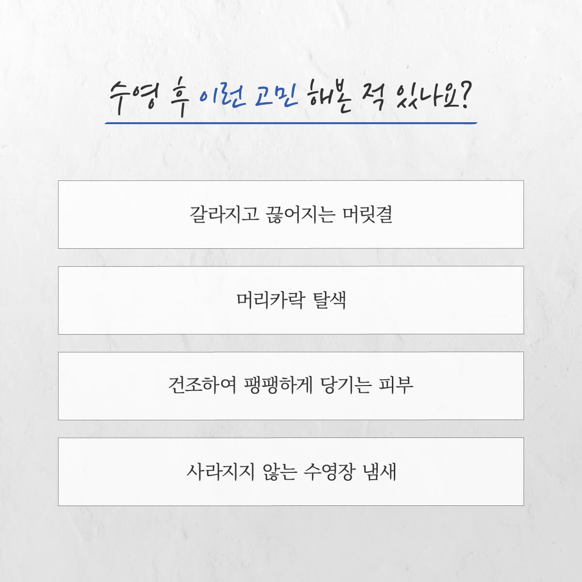 - 바디로션 : 샴푸, 바디클렌저와 다르게 무향이다. 자연보습인자가 들어가 수영 후 건조해진 피부를 진정시켜 준다.
