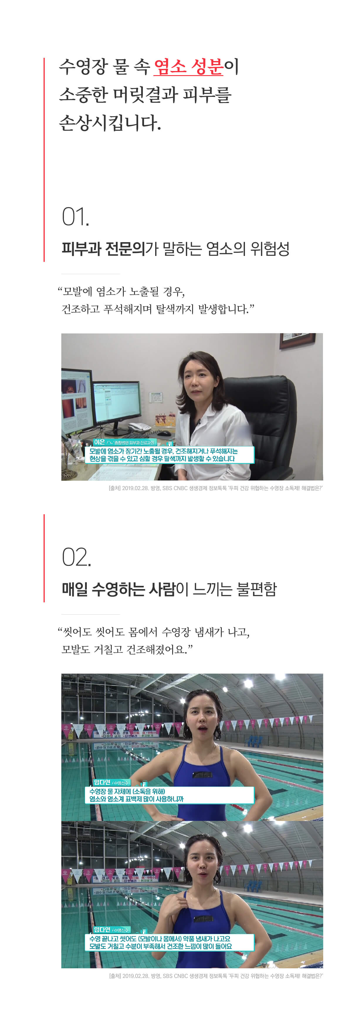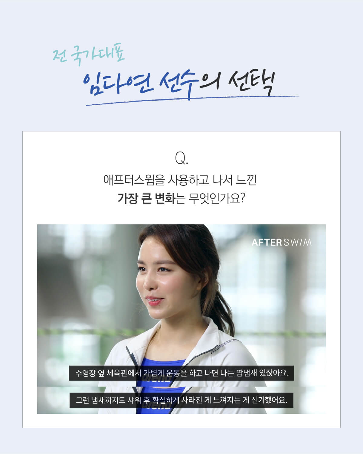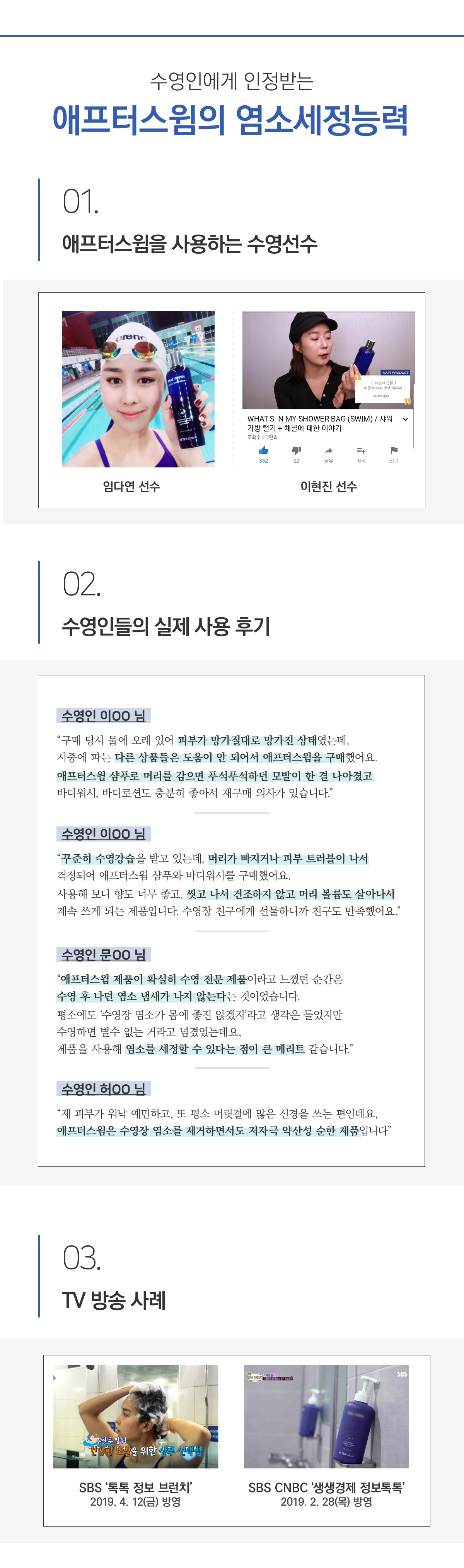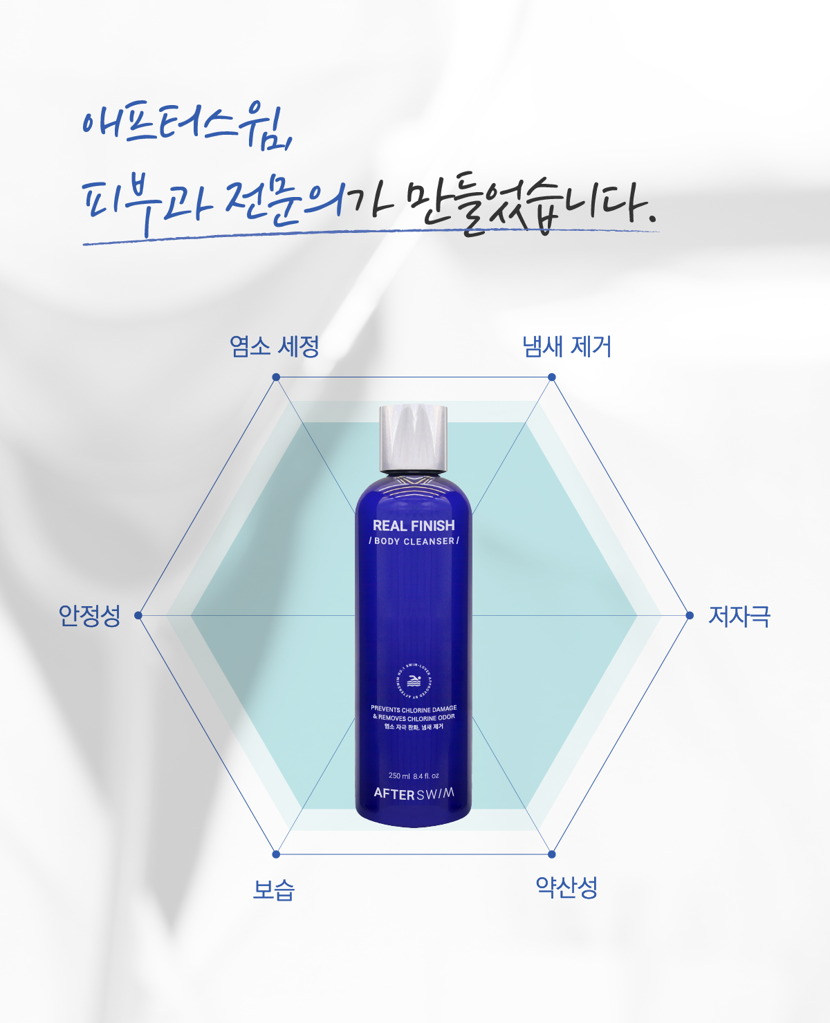 - 바디클렌저 : 샴푸와 같은 향이 난다. 씻은 후에 뽀드득한 느낌은 덜하지만 염소 냄새는 확실히 사라졌다. 살짝 미끄러운 느낌이 드는 것은 수영 후 건조한 피부를 위한 보습 성분이 들어있기 때문이다. 피부가 예민한 편인데도 전혀 자극이 없고 순하다.