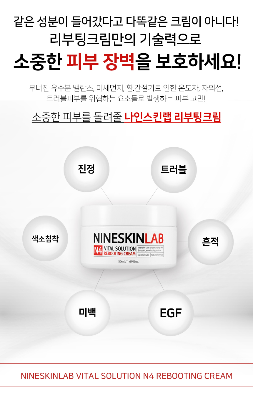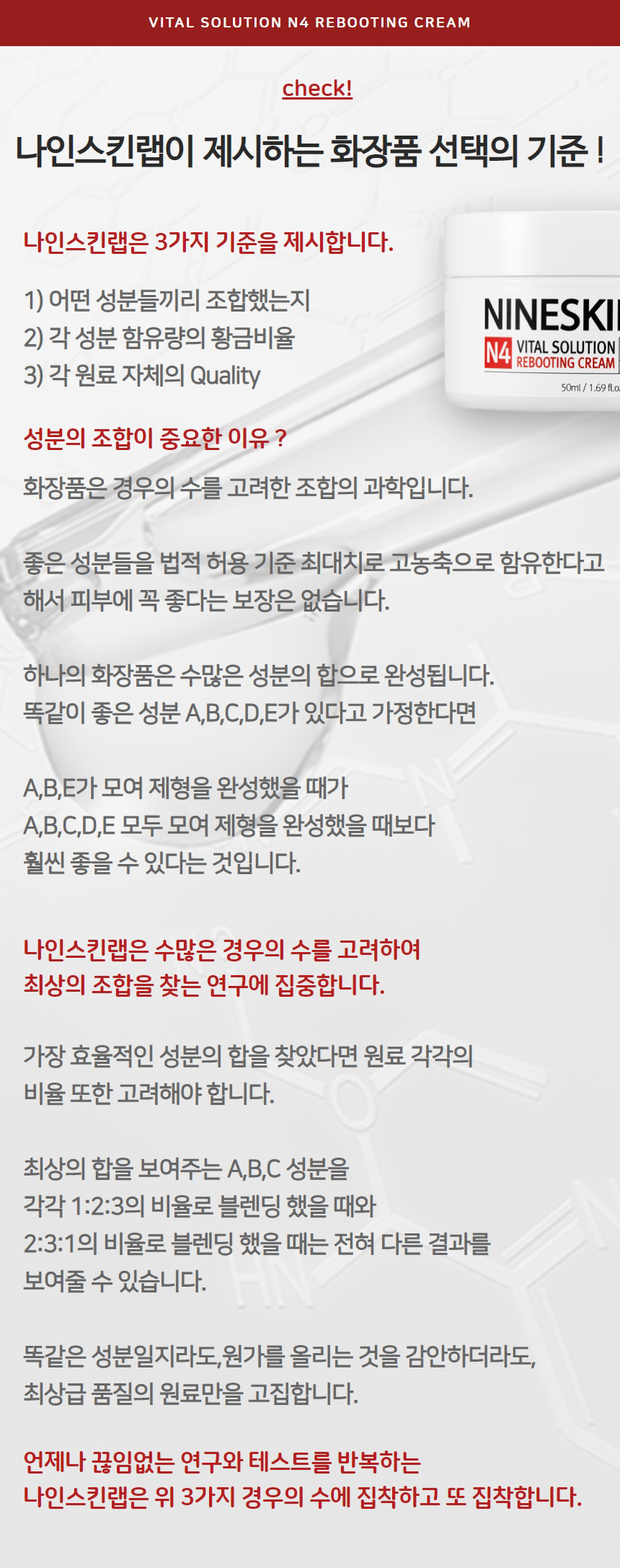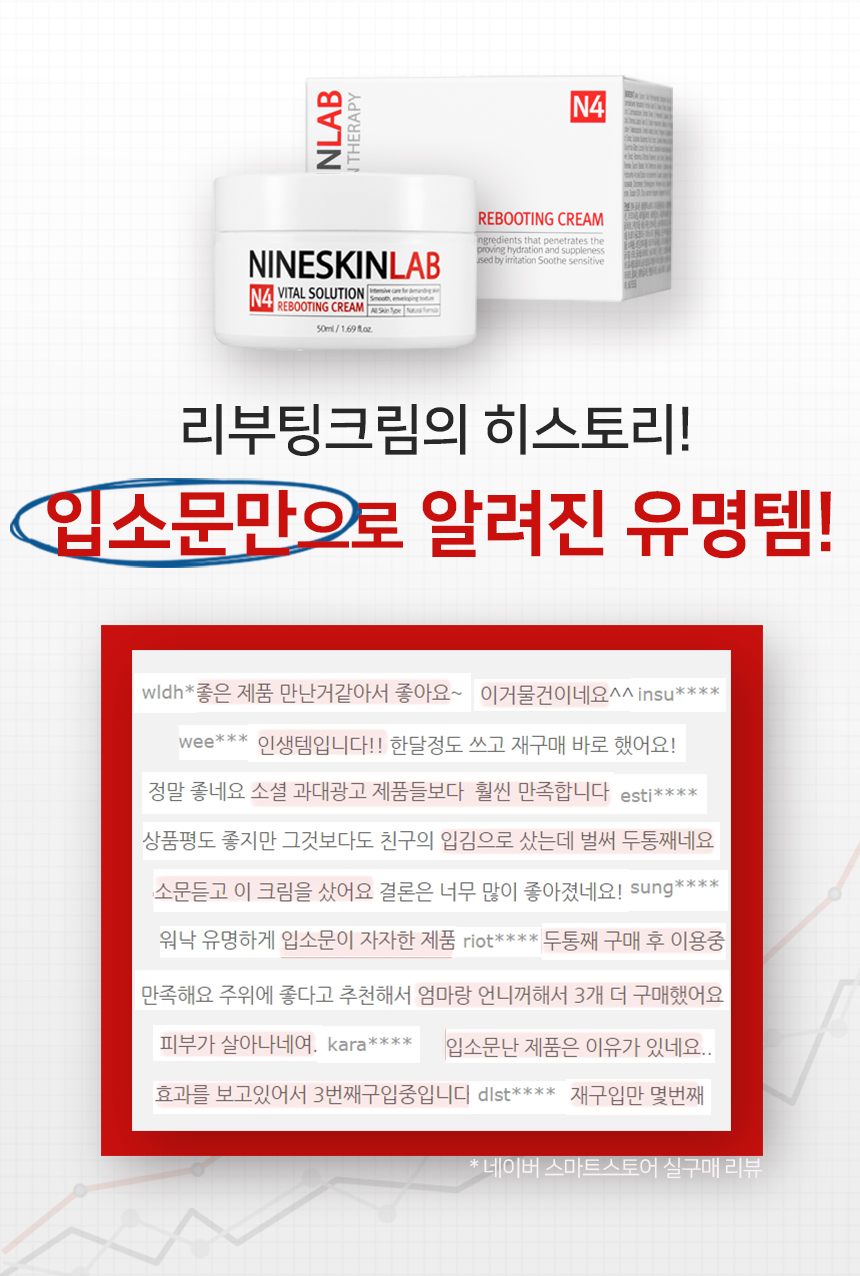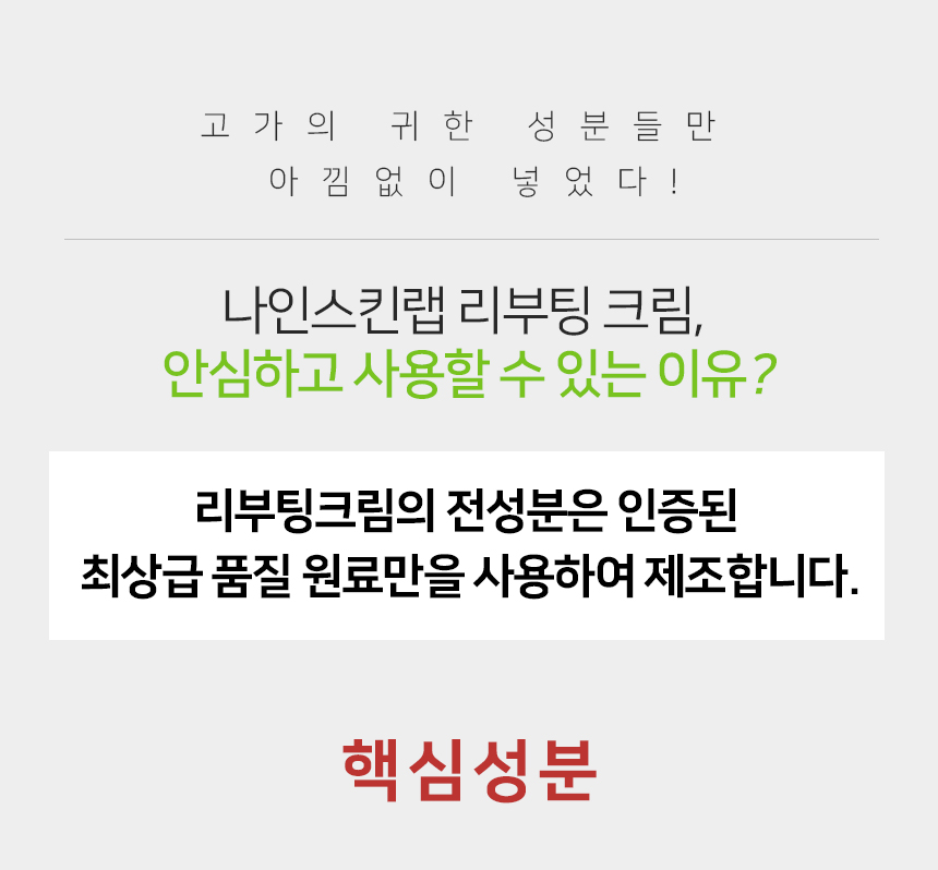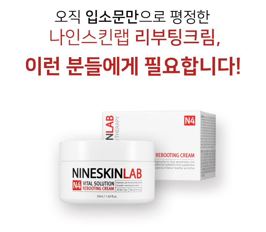 - 화장품은 어떤 성분으로 조합했는 지가 사실 너무나도 중요한데, 나인스킨랩 리부팅 크림은 각 성분의 비율과 조합만을 오랜시간 연구하여 탄생했다는 점을 어필해주세요.