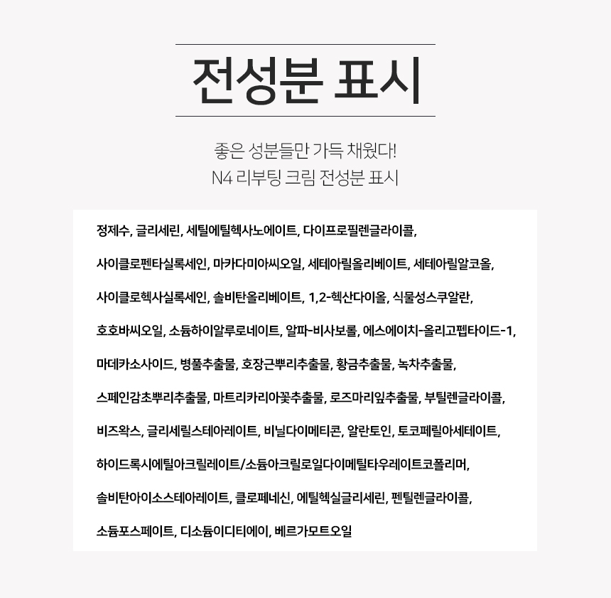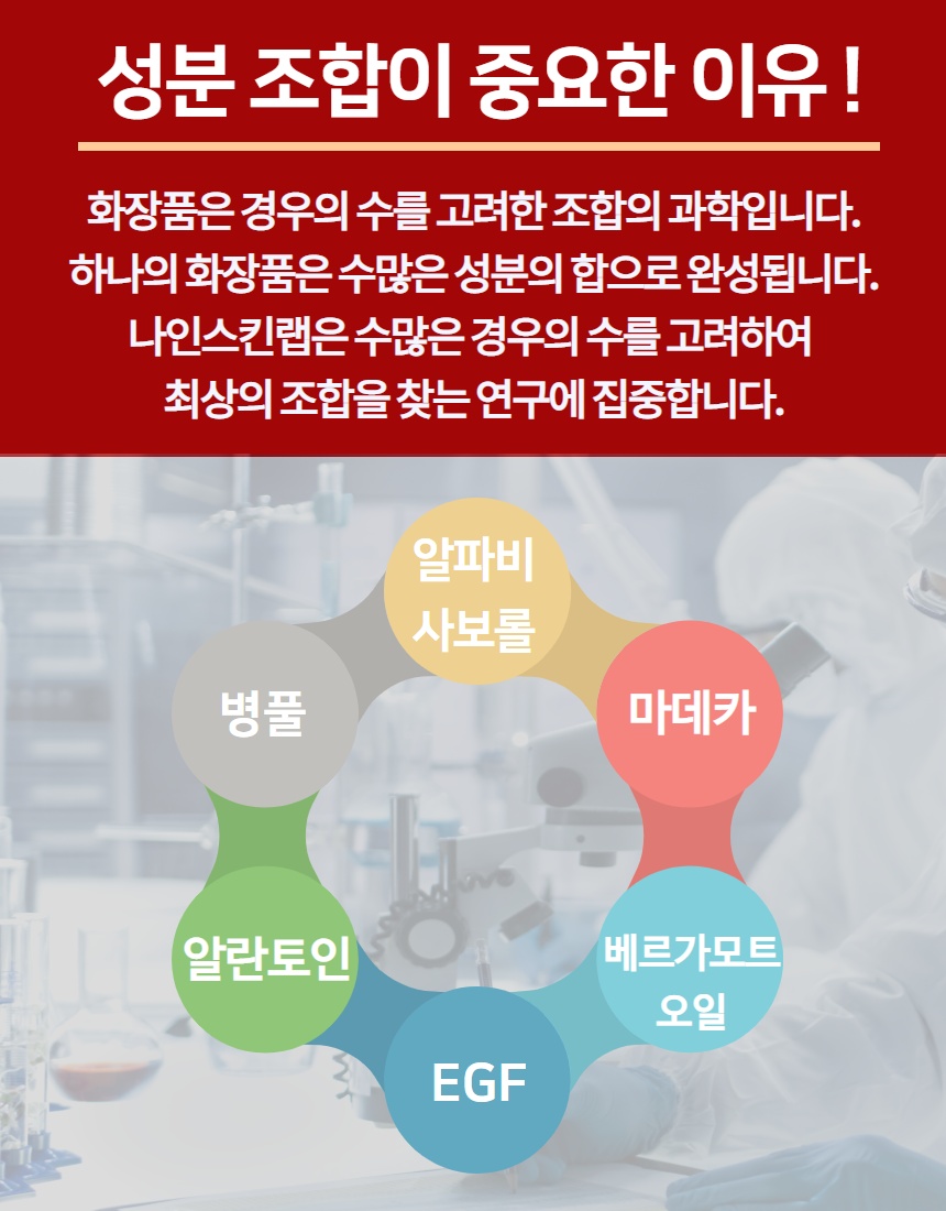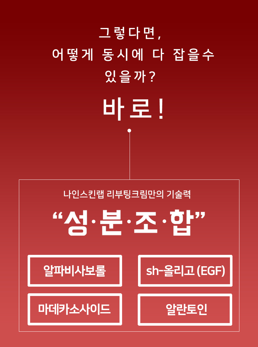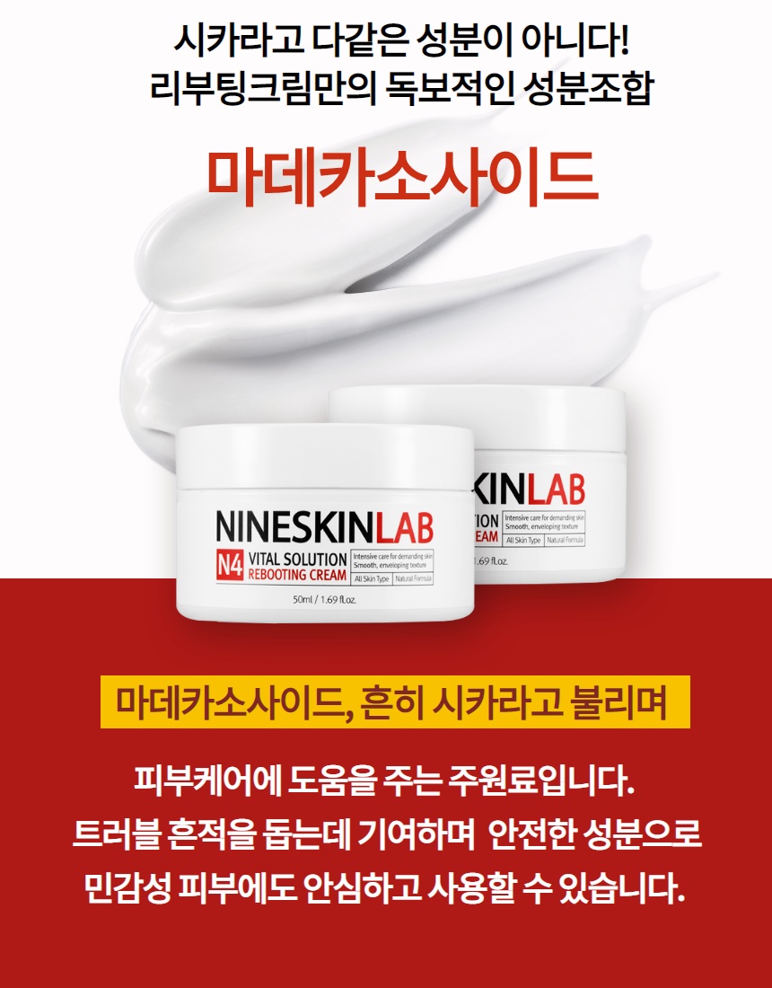 - 화장품은 어떤 성분으로 조합했는 지가 사실 너무나도 중요한데, 나인스킨랩 리부팅 크림은 각 성분의 비율과 조합만을 오랜시간 연구하여 탄생했다는 점을 어필해주세요.