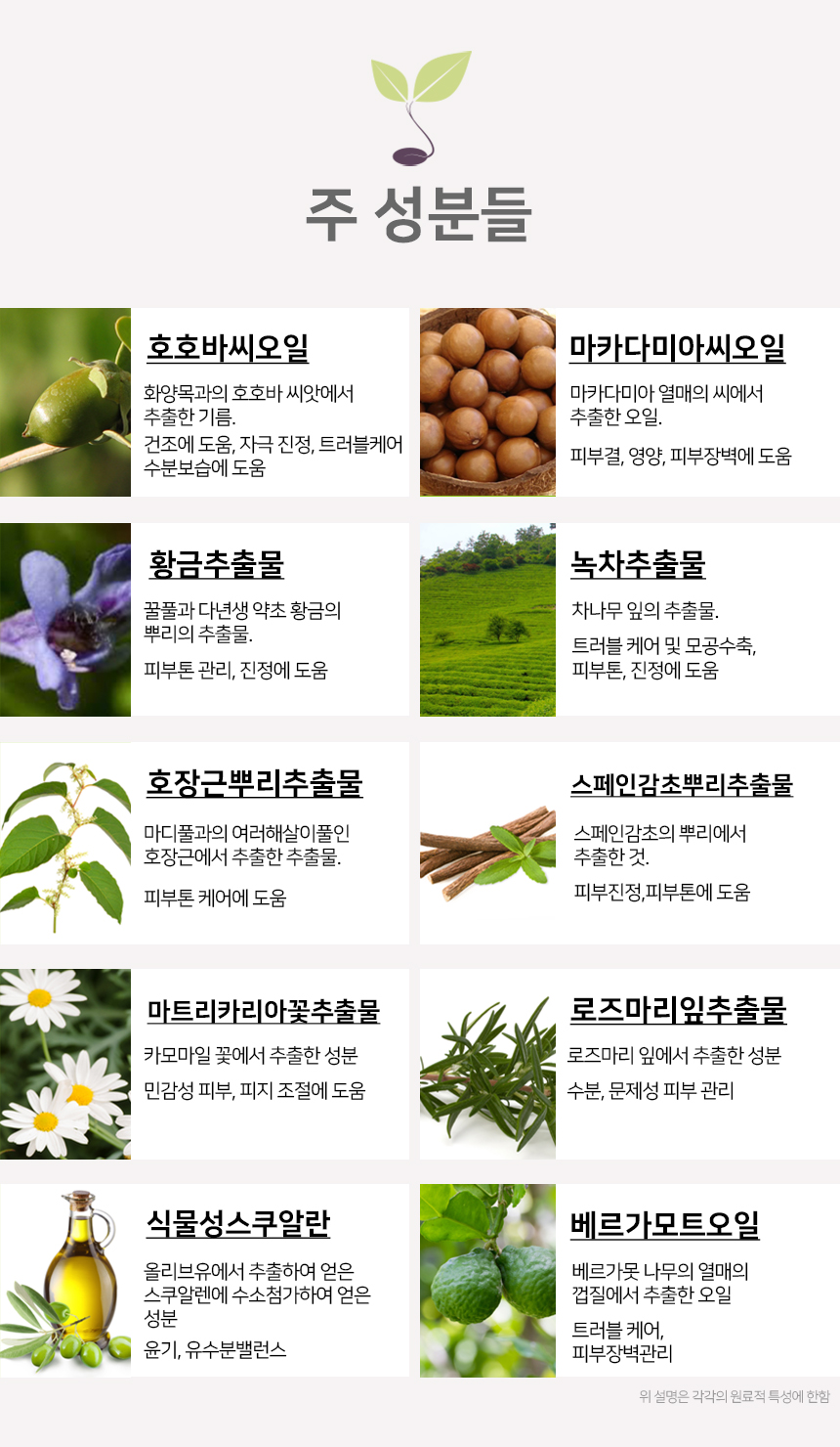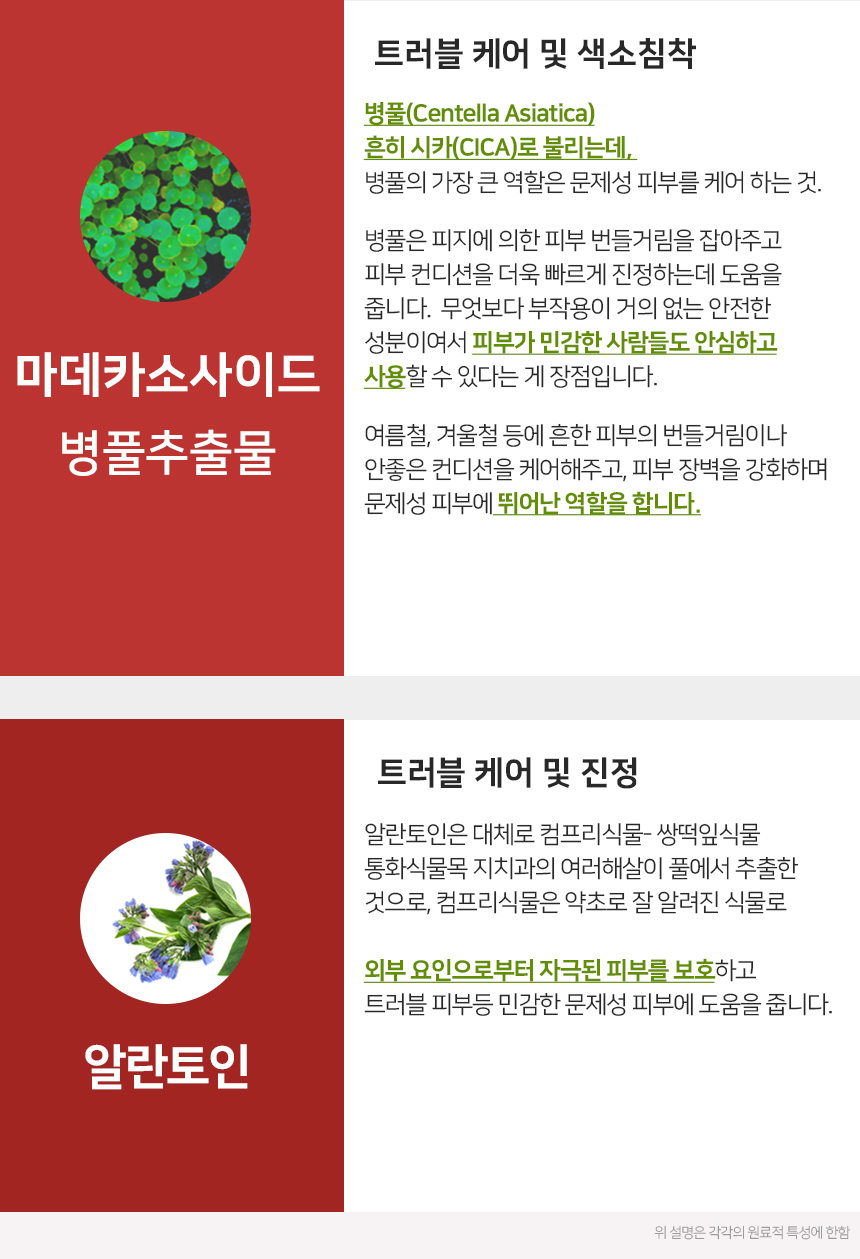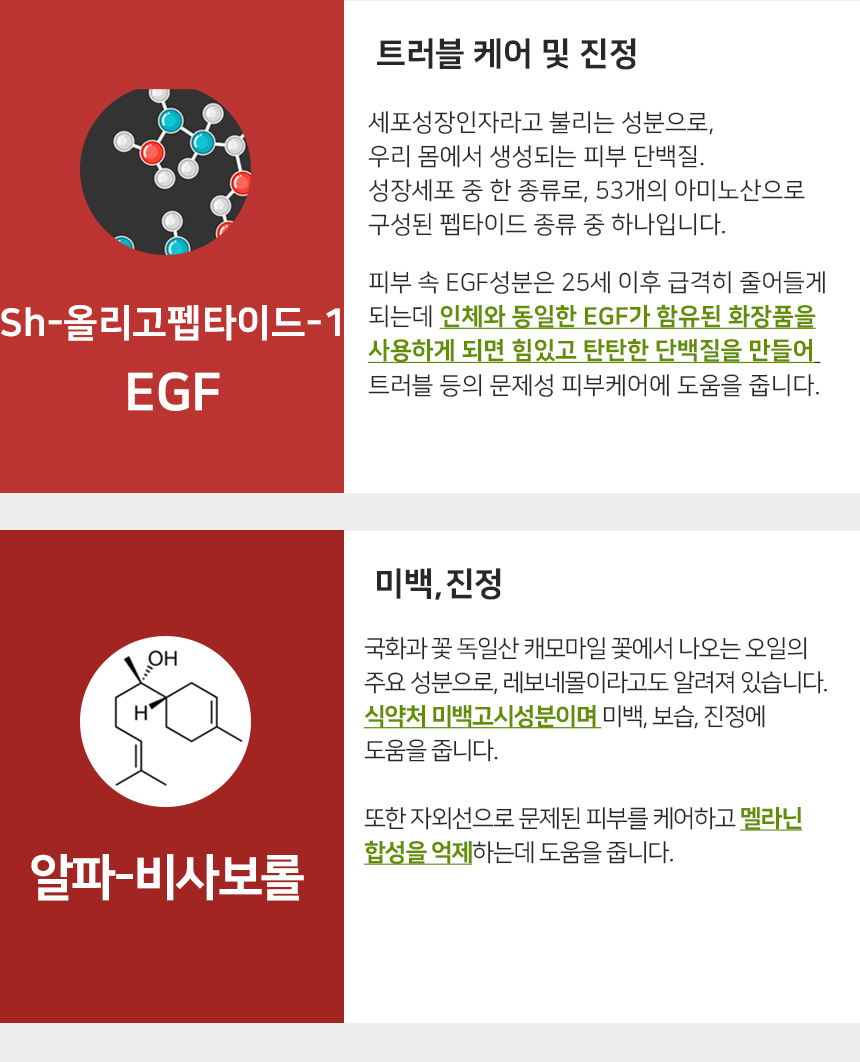 - 상세페이지 내 어필하고 있는 성분들의(EGF, 마데카소사이드, 알파비사보롤, 알란토인, 병풀추출물, 베르가모트오일) 장점에 대한 언급도 해주세요.