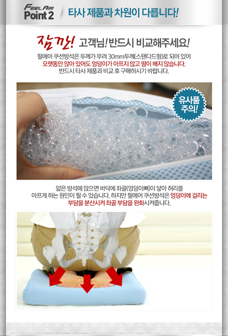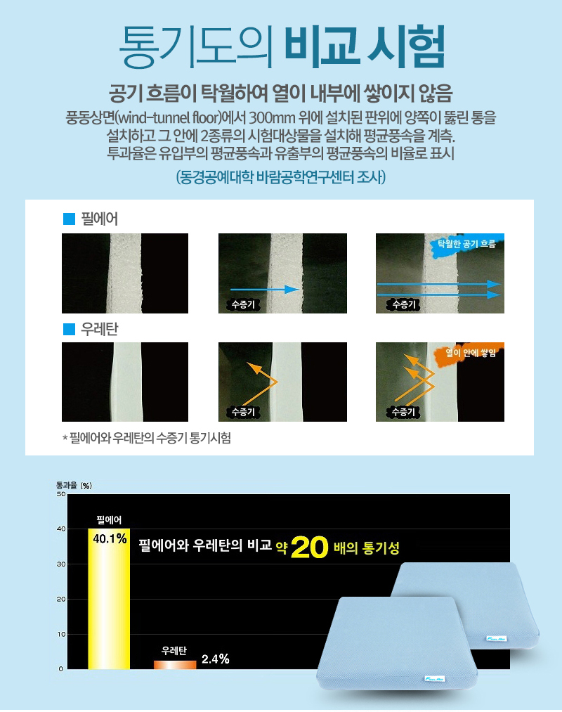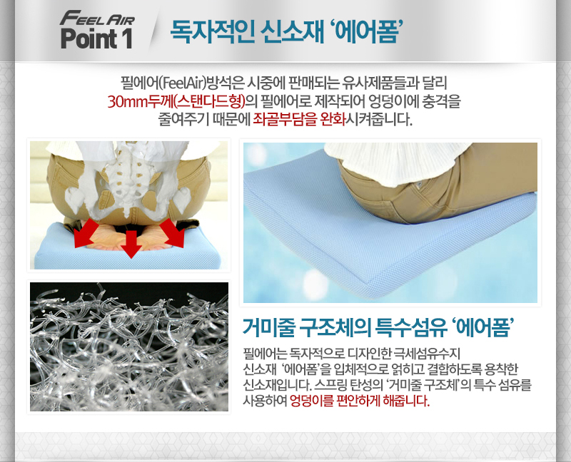 필에어방석의 내부섬유는 극세섬유수지 신소재인 '에어폼'이란 섬유를 사용하였습니다.