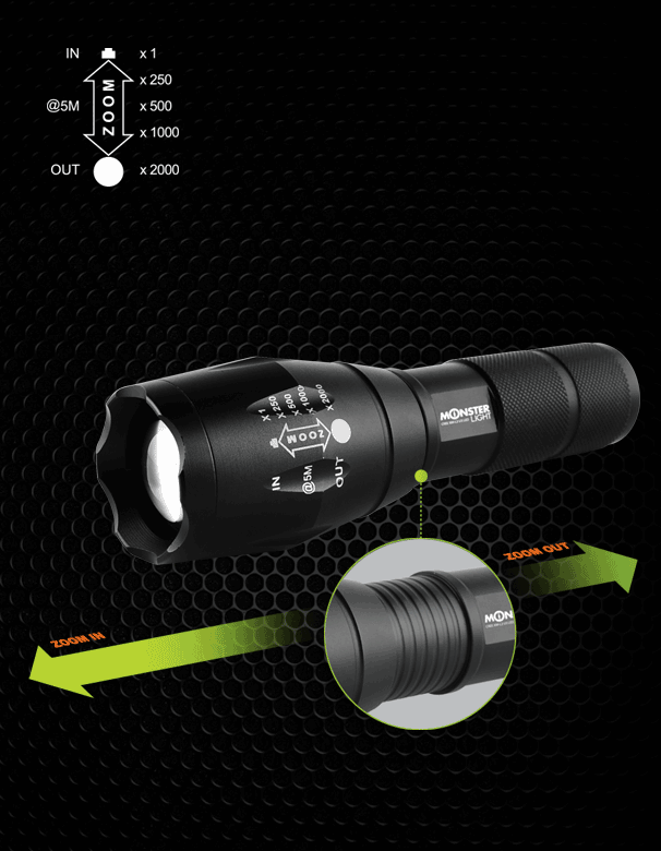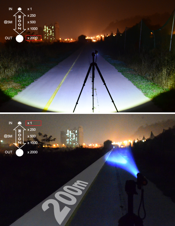 줌 인이 되며 이때 광폭이 좁아지면서 최대 200미터까지 직진으로 빛이 날아갑니다.