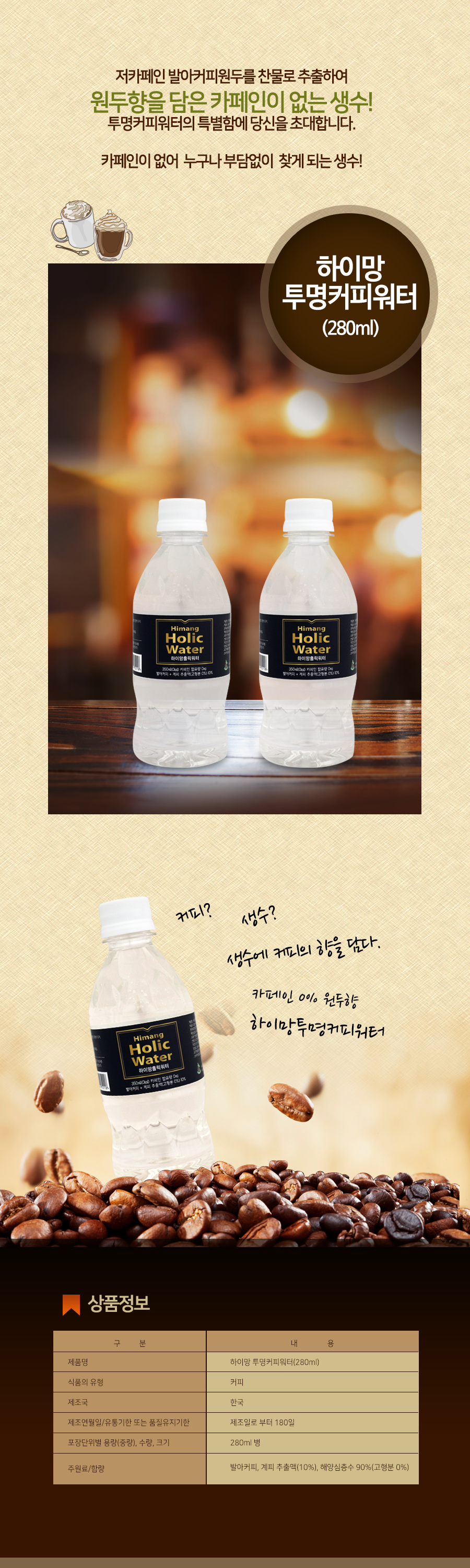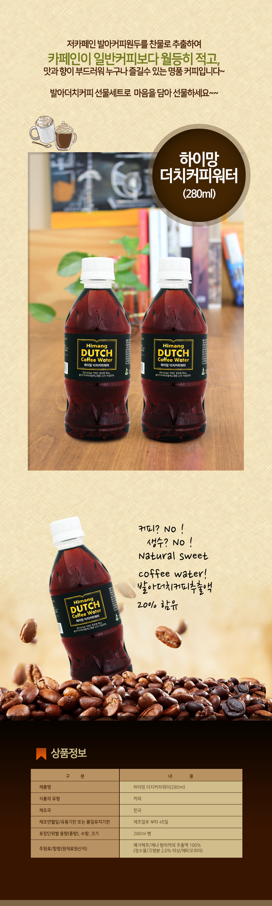 - 더치커피 특징인 저카페인과 특허 기술로 내린 더치 커피입니다. 투명 커피 워터는 무카페인 커피 생수이며 더치 커피 워터는 커피와 생수를 섞어서 만든 커피 워터 제품입니다. 현재 제일 인기가 많은 음료입니다.