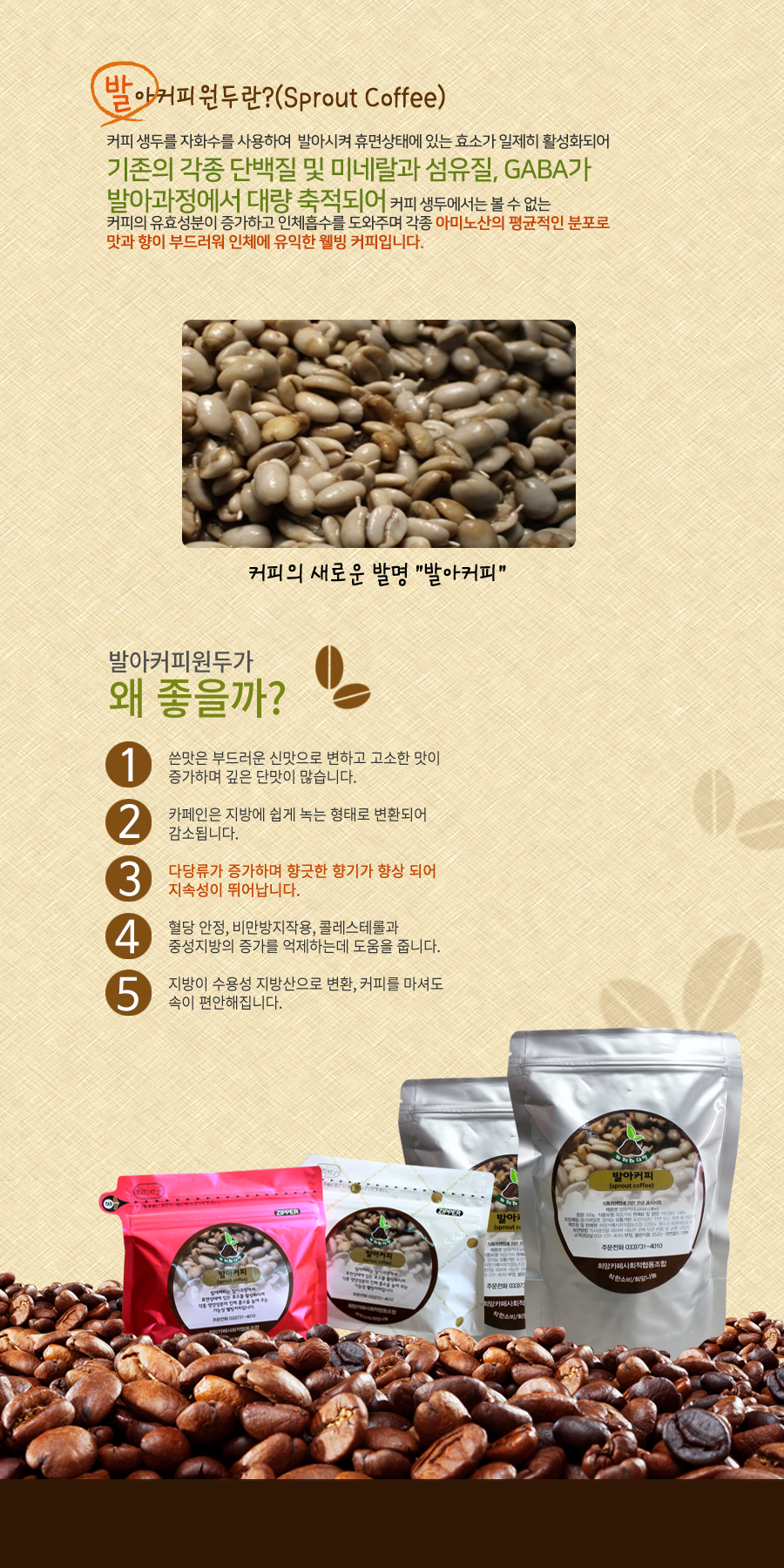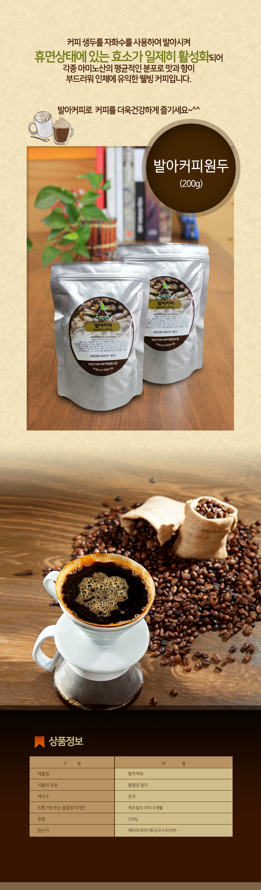 커피 생두를 자화수로 발아시켜 휴면 상태에 있는 효소가 일제히 활성화되어 기존의 각종 단백질 및 미네랄과 섬유질,GABA가 발아과정에서 대량 축적되어 커피 생두에서는 볼 수 없는 커피의 유효 성문이 증가하고 인체흡수를 도와줍니다. 커피의 탄냄새는 없애고 쓴맛은 줄이고 깊은 향과 부드러운 맛을 느낄 수 있습니다. 커피는 원래 쓴맛이 아닙니다.