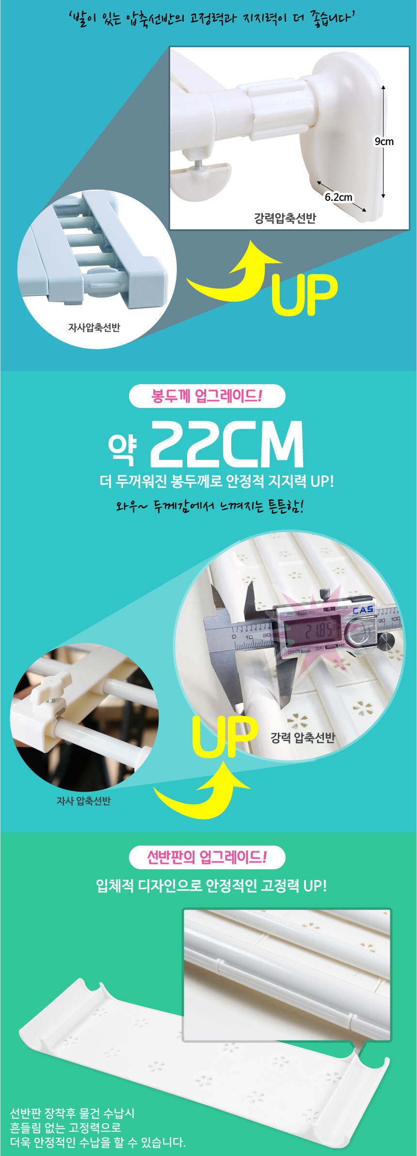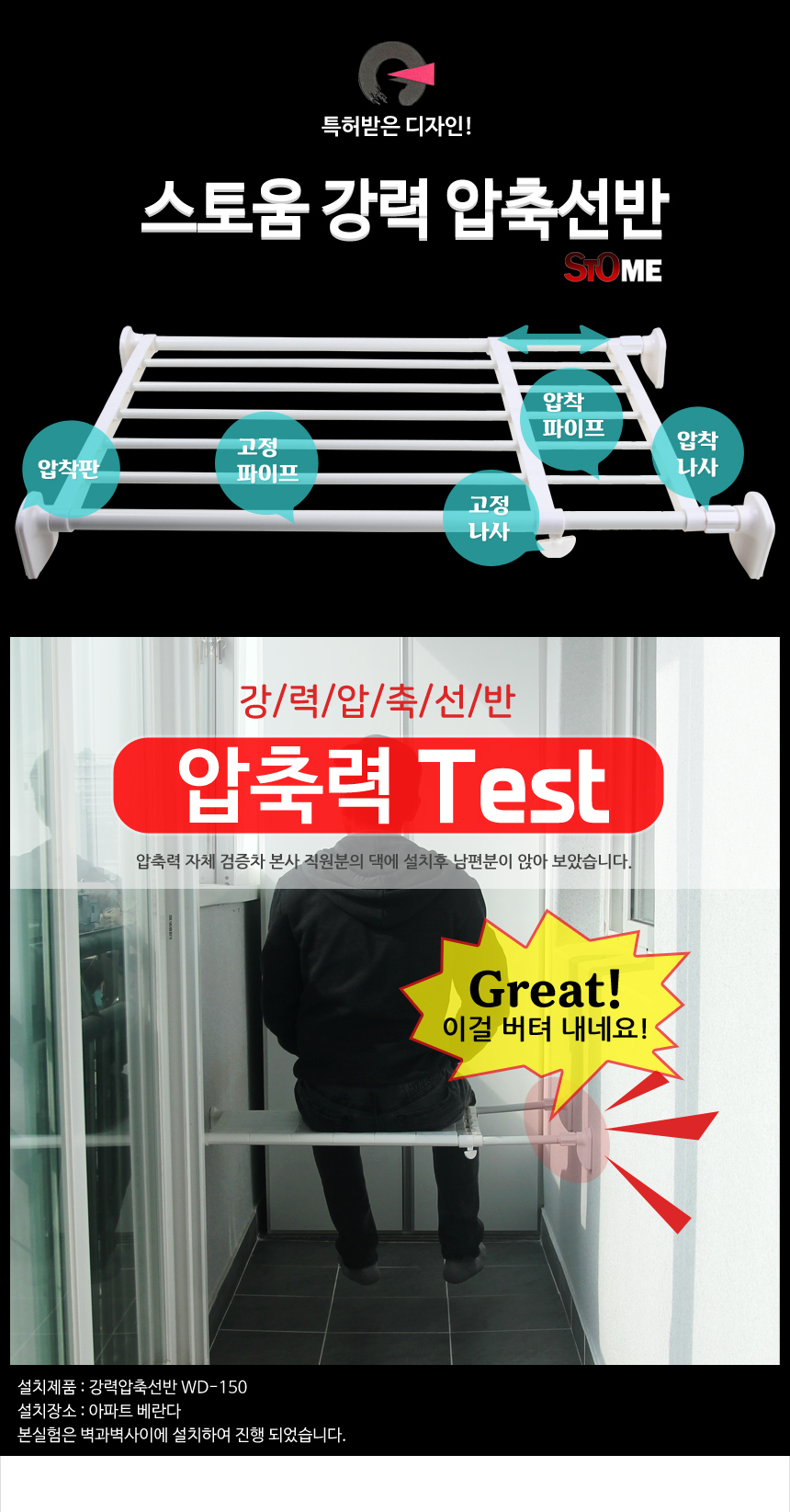 - "압축 선반을 잡고 세게 흔들었을 때, 조금이라도 밑으로 내려가지 않는다면 설치가 제대로 된 것이고, 한 쪽이 빠지거나 내려간다면 다시 설치하셔야 합니다." 라는 멘트