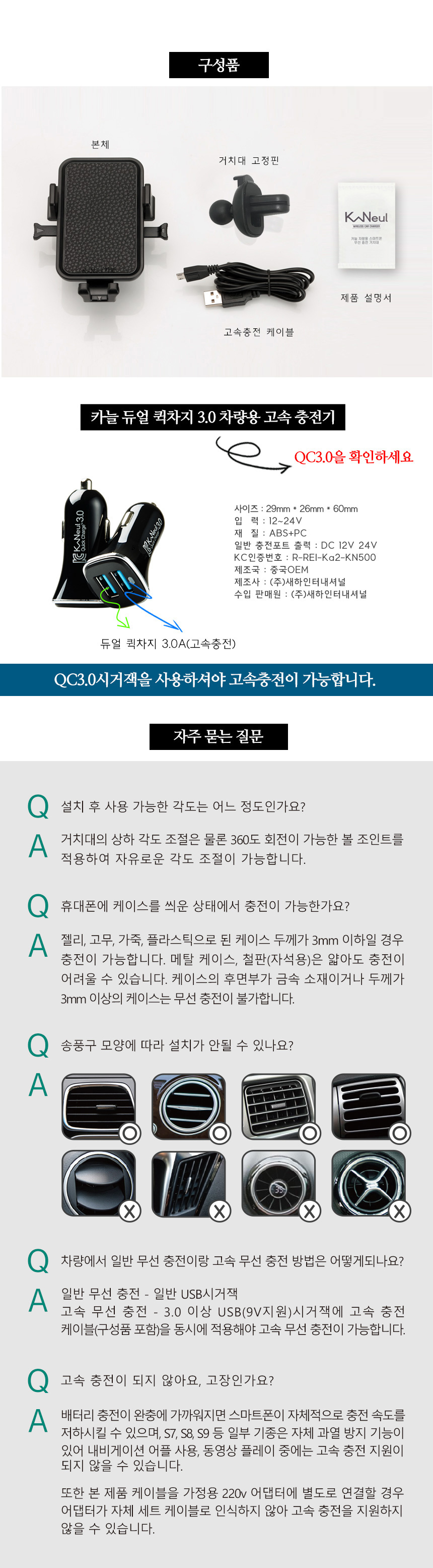 - 고속 충전이 되려면 휴대폰, 충전기, 충전 케이블, 퀵차지 모두 고속 충전이 가능한 제품이어야 합니다. (본체와 케이블은 보내드립니다.)